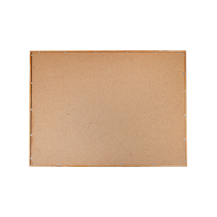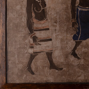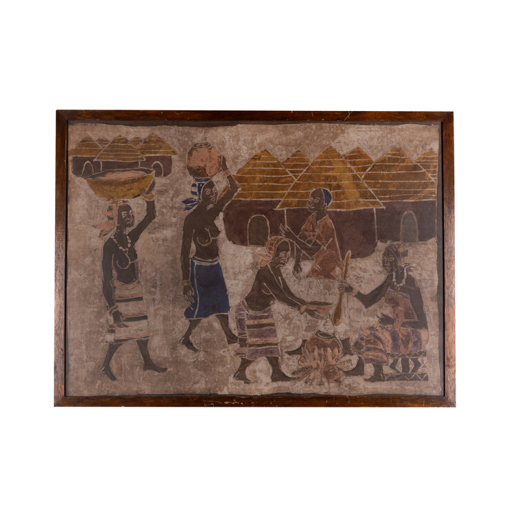 Traditioneel Afrikaanse Bògòlanfini of Bogolan, letterlijk vertaald "modderdoek". Dit is een traditionele textielsoort die haar naam dankt aan de verf, een speciale soort modder. Het doek toont een groep vrouwen, met op de achtergrond woningen. Het is ingelijst in een houten lijst met glas. Datering: 20ste eeuw. Conditie: het doek is in goede conditie, de lijst toont gebruikssporen. Afmetingen: ca. 74 x 100 cm.