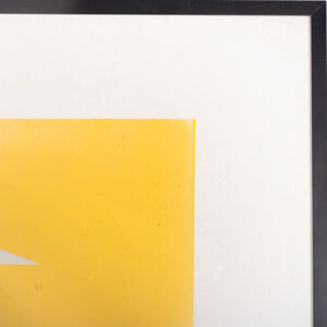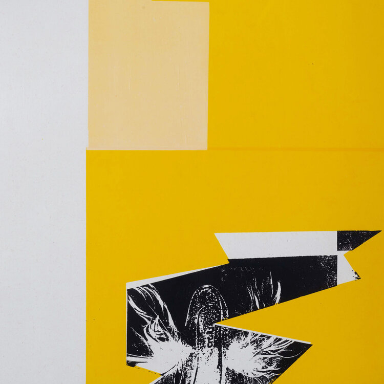 J. Klaasen, 'Zonder Titel', datering onbekend. Zeefdruk Unica 1, in zwart metalen lijst met kunststof plaat. Abstract werk van een groot geel vlak in twee tinten, met zwart-wit foto's van een schoen met veren in verschillende bewerkingen. Signatuur ontbreekt. Conditie: vertoont gebruikssporen. Afmetingen incl lijst: ca 116 x 83 cm.