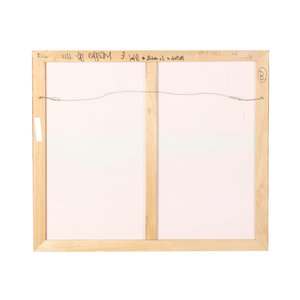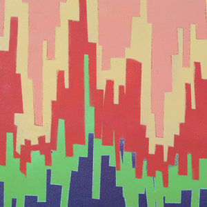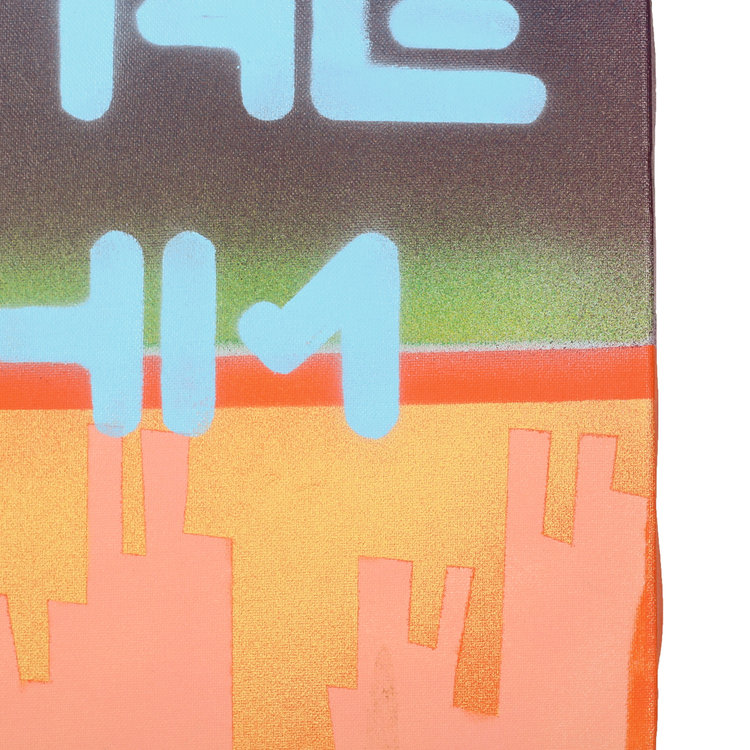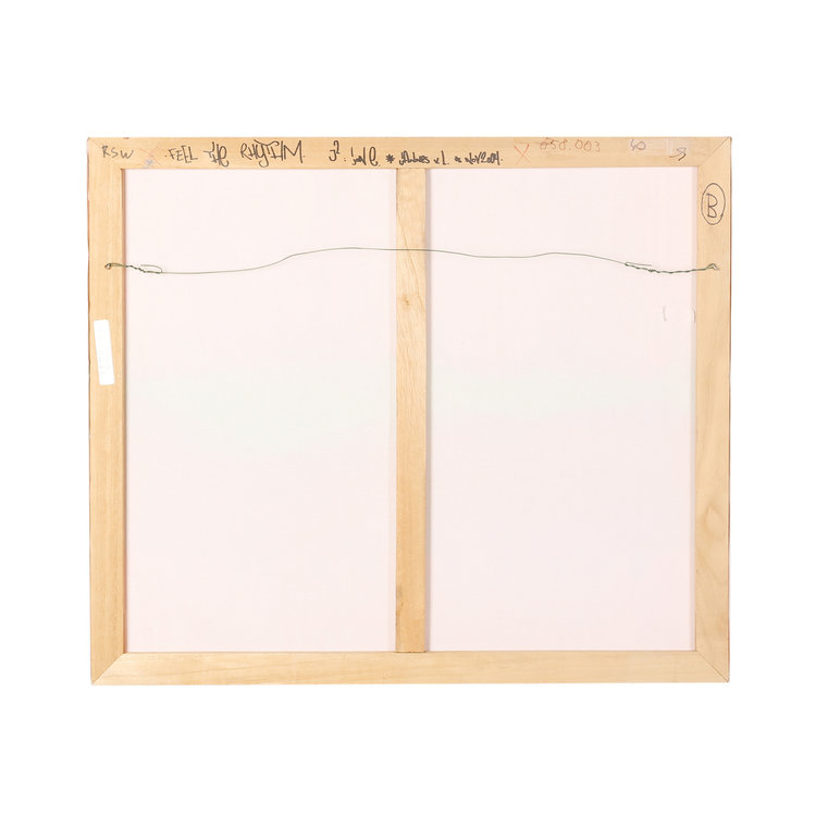 J2, Feel the rhythm, 2004. Graffity op doek. Abstracte voorstelling van kleurrijke, hoekige lijnen. In het midden in blauw de tekst: Feel the rhythm. Conditie: goed, lichte gebruikssporen. Afmeting: 60 x 69 cm.