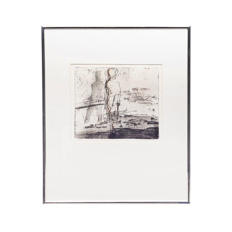 Jacqueline Tollenaar, 'De mens en zijn schaduw'. Ets/aquatint, oplage 6/15, in zilverkleurige kunststof lijst met passe-partout. Zwart-wit afbeelding met bruine accenten van een figuur in lijnen met ernaast een schaduw in grijstinten. Signatuur rechtsonder. Datering onbekend. Conditie: gebruikssporen lijst. Afmetingen lijst: 61 x 51,5 cm; beeldvlak: 24,5 x 29 cm.