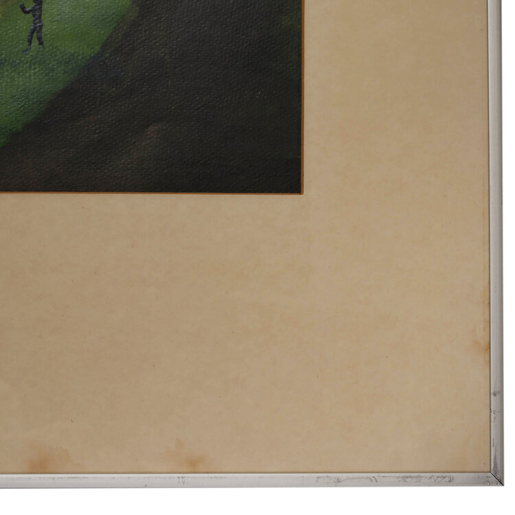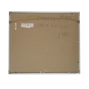 Jan Bultje, Cirkels, jaartal onbekend. Gemengde techniek op papier in metalen lijst. Afbeelding van een kleurrijk landschap in cirkels met daarin twee figuren in zwart. Conditie: gebruikssporen aan de lijst. Afmeting lijst: 70 x 81 cm.