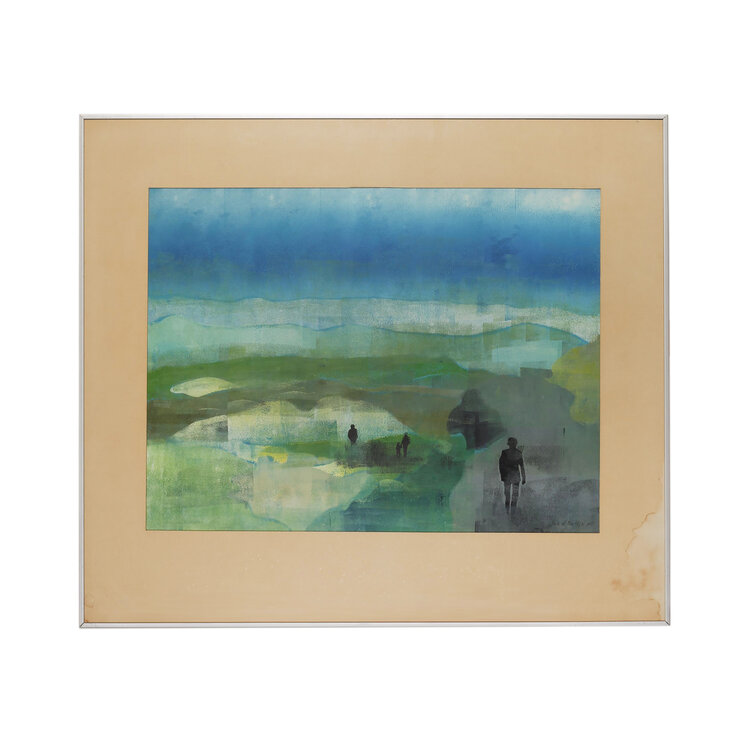 Jan Bultje, Perveri (Turkye), 1975. Monoprint op papier in metalen lijst. Afbeelding van een landschap in blauw en groen met vier wandelende figuren in zwart. Conditie: gebruikssporen aan de lijst. Afmeting werk zonder lijst: 47 x 61 cm; incl. lijst: 58 x 80,5 cm.