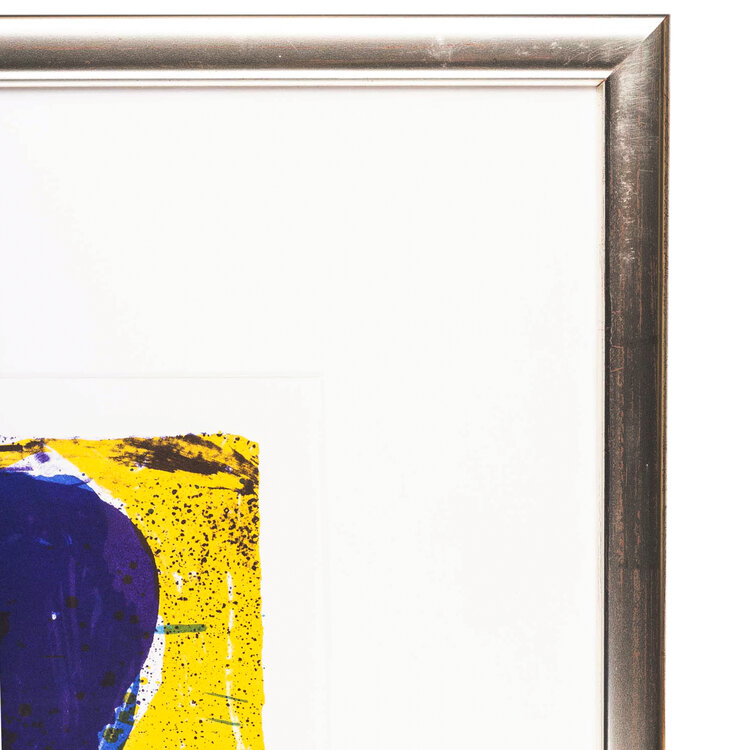 Jan Cremer, 'Hommage a Fanny Ardant II', 1993. Kleurenlitho in zilverkleurige lijst, oplage 52/60. Abstracte voorstelling met twee blauwe hartvormen voor een gele achtergrond. Linksonder oplagenummer, rechtsonder signatuur en jaar. Conditie: goed, lichte gebruikssporen aan lijst. Afmeting lijst: 50 x 60 cm.