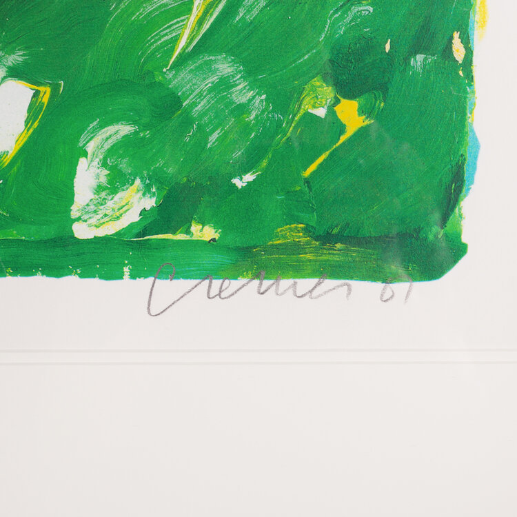 Jan Cremer, 'Korenschoven I', 2001. Zeefdruk in zilverkleurige lijst, oplage 118/250. Zomerse voorstelling van een landschap met korenschoven. Linksonder oplagenummer, rechtsonder signatuur en jaar. Conditie: goed. Afmeting lijst: 78 x 94 cm; beeldvlak: 48 x 67 cm.