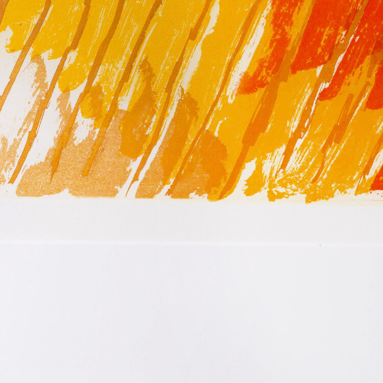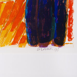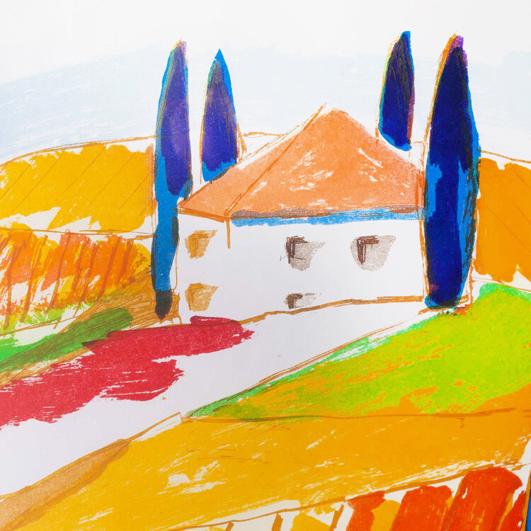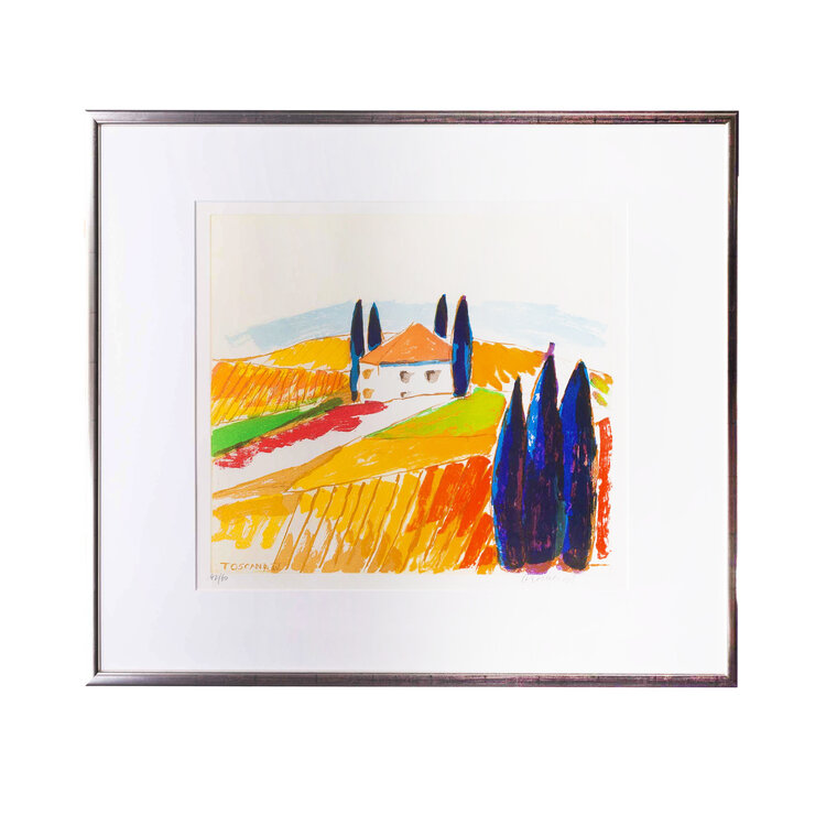 Jan Cremer, 'Toscana IV', 1998. Ets op papier in zilver-kleurige lijst, oplage 40/60. Kleurrijke voorstelling van een heuvellandschap met een woning en puntige bomen in blauw, rood, geel, groen en oranje. Linksonder titel en oplagenummer, rechtsonder signatuur en jaar. Conditie: goed, de lijst toont lichte gebruikssporen. Afmeting lijst: 79 x 88 cm.