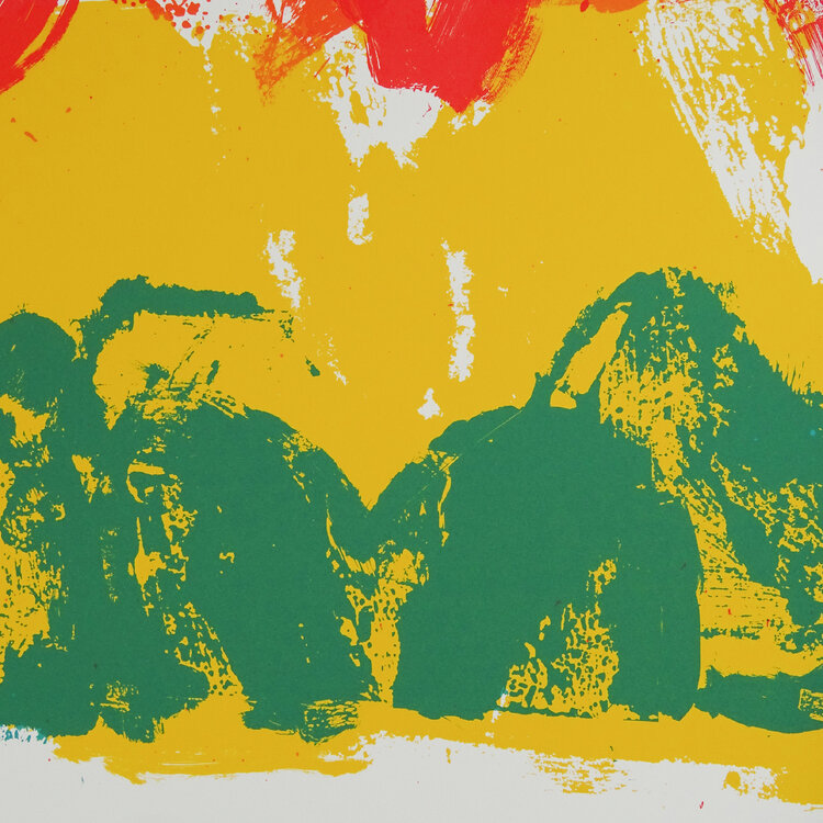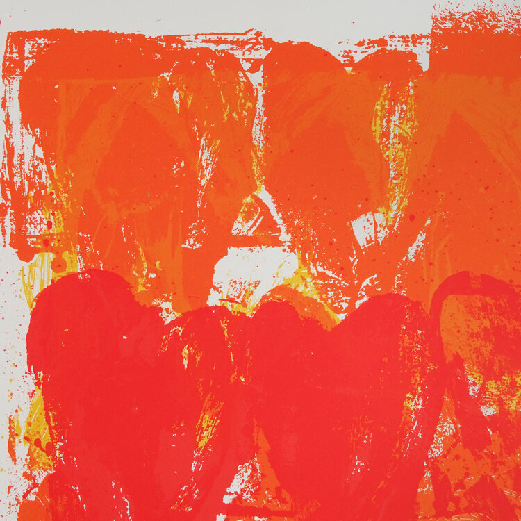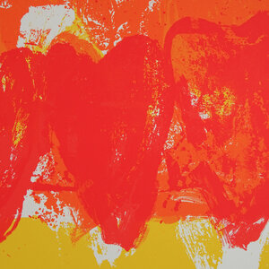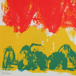 Jan Cremer, Tulipfield, 1997. Zeefdruk op papier zonder lijst, oplage 42/60. Abstracte voorstelling van een tulpenveld in oranje, rood, geel en groen. Linksonder oplagenummer, rechtsonder signatuur en jaar. Conditie: paar kleine kreukjes en scheurtjes aan de randen, maar verder in goede staat. Afmeting: 106 x 75 cm.