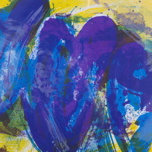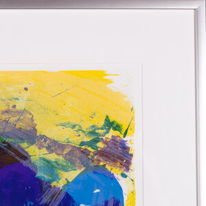 Jan Cremer, 'Tulpen 1991 - 15', 1991. Kleurenlitho in zilverkleurige lijst, oplage 34/65. Abstracte voorstelling met drie paars-blauwe tulpen voor een gele achtergrond. Linksonder oplagenummer, rechtsonder signatuur en jaar. Conditie: goed, lichte gebruikssporen aan lijst. Afmetingen beeldvlak: ca. 46 x 60 cm; lijst: 68 x 82 cm.