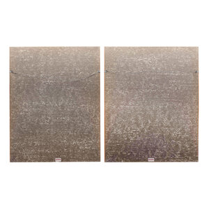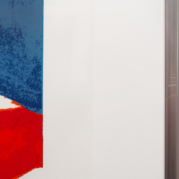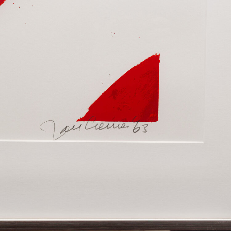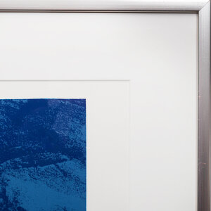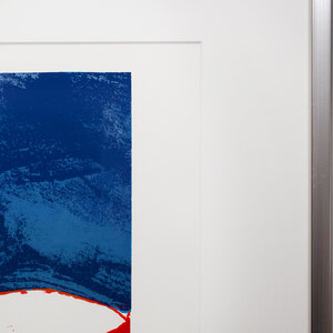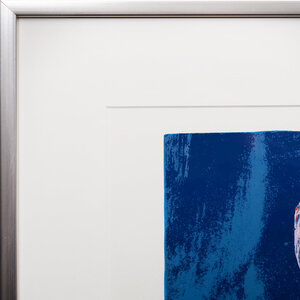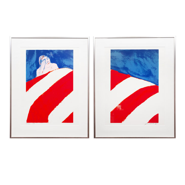 Jan Cremer, tweeluik 'Tears on Kennedy’s Coffin', 1987. Zeefdruk in zilverkleurige lijst, oplage 77/80. Tweeluik met een figuur achter een rood-wit gestreept vlak voor een blauwe achtergrond. Op het linker werk staat het oplagenummer en jaar van de druk, op het rechter werk signatuur en jaar van originele werk. Conditie: goed, lichte gebruikssporen aan lijst. Afmeting per lijst: 90 x 71 cm.