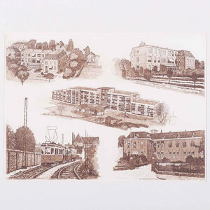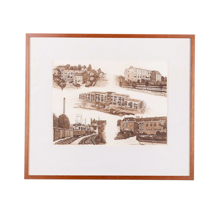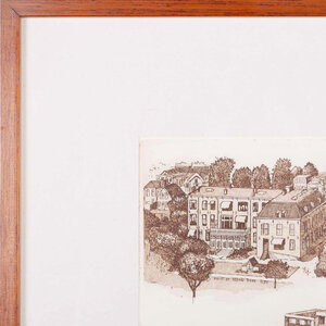 Jan Klinkenberg, Zeeweg rond 1950 , Wilhelminastraat Huize st. Jeroen rond 1920, 1990. Ets in houten lijst. Charmante historisch zicht van diverse straten in Noordwijk. Conditie: goed met gebruikssporen aan de lijst. Afmetingen: werk 22 x 29; lijst 37 x 43 cm.
