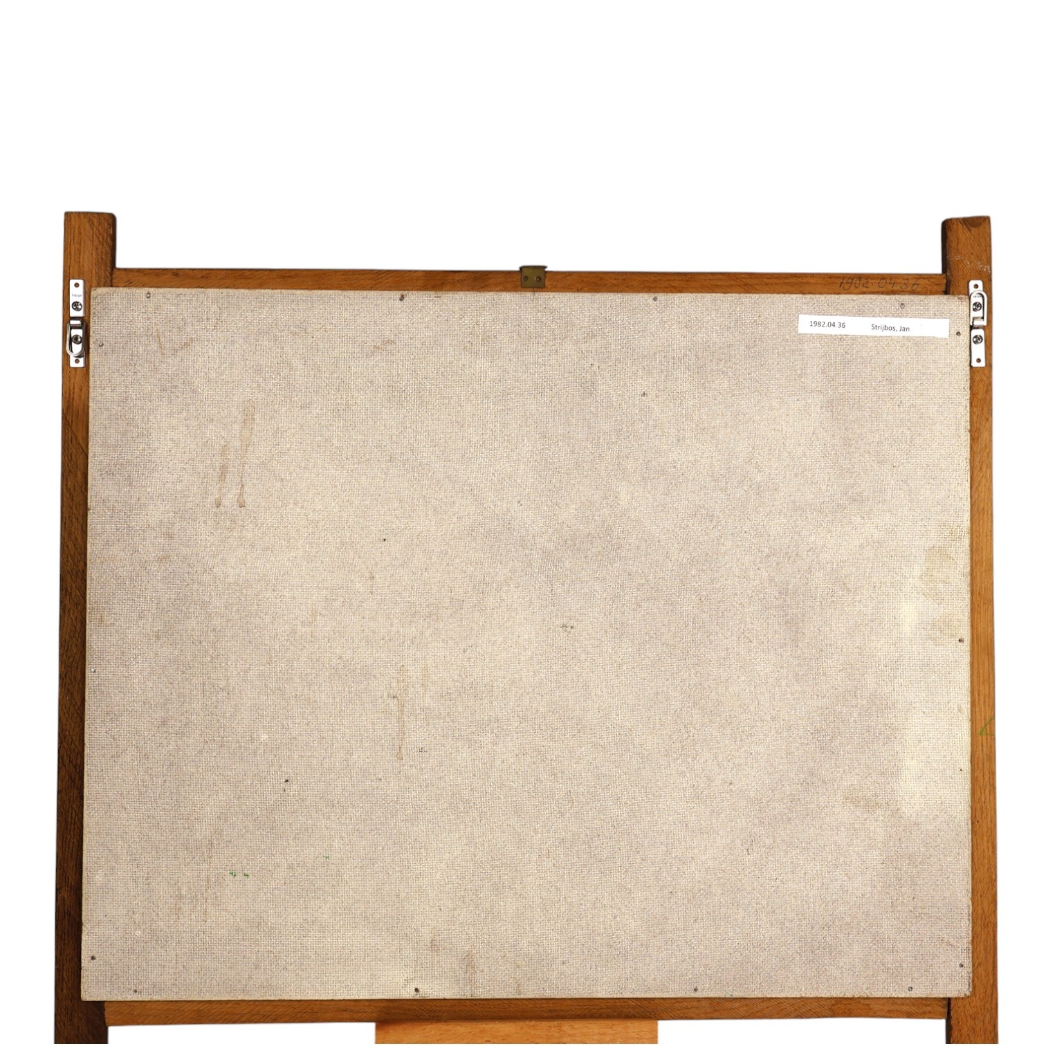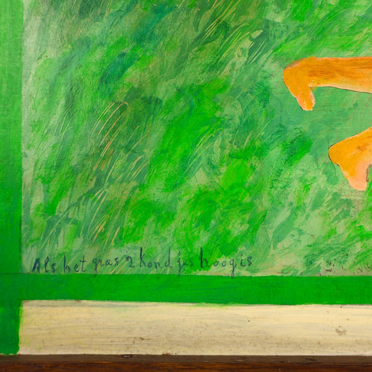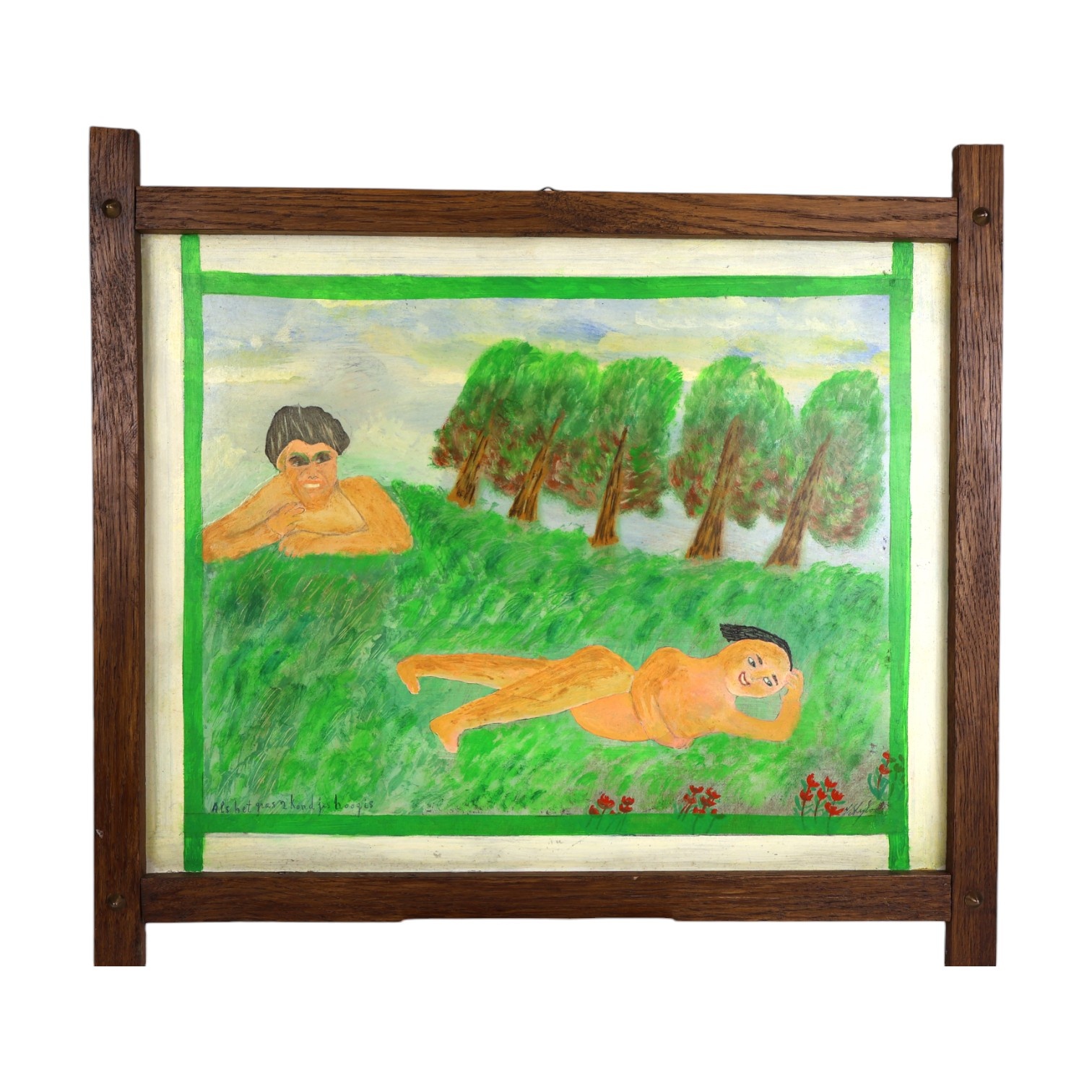 Jan Strijbos, 'Als het gras 2 kondjes hoog is', 1970-1980. Olieverf op hardboard in houten lijst. Schilderij van twee personen in een veld. Titel linksonder. Signatuur rechtsonder. Jan (Johannes) Strijbos (Eindhoven 1896 - Merkelbeek 1977) was timmerman van beroep en na zijn pensioen een autodidact-kunstschilder in de naïeve stijl. Hij maakte zijn houten lijsten zelf. Conditie: goed. Afmetingen: beeldvlak 40 x 50 cm, met lijst 49 x 53 x 1 cm.