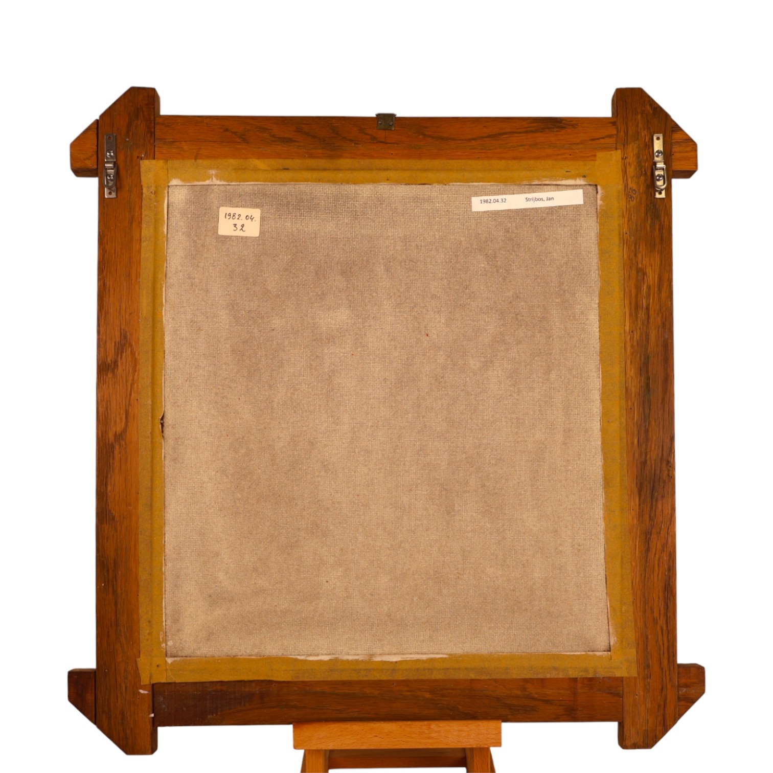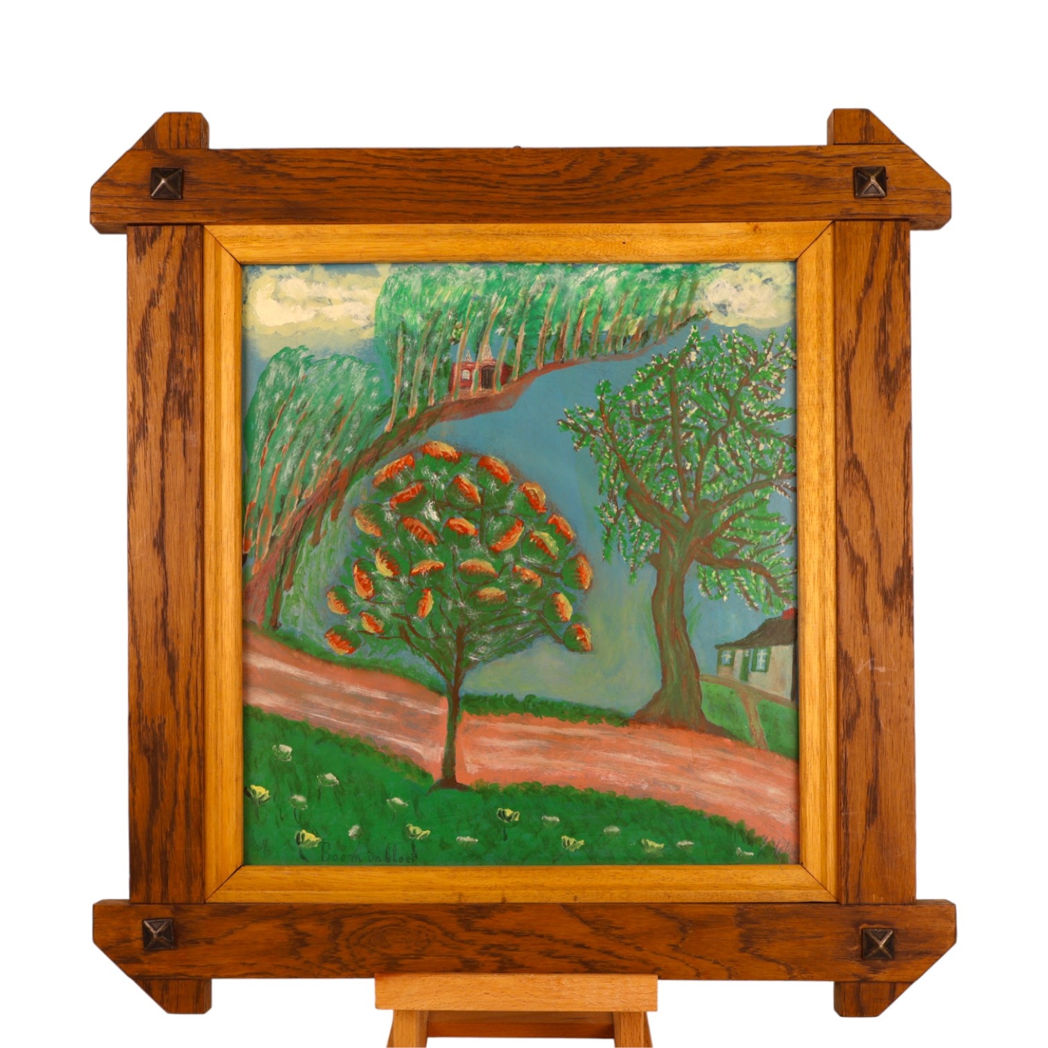 Jan Strijbos, 'Boom in bloei', 1960-1980. Olieverf op hardboard in houten lijst met hoekdecoratie. Schilderij van bomen naast een pad. Titel linksonder. Signatuur rechtsonder. Jan (Johannes) Strijbos (Eindhoven 1896 - Merkelbeek 1977) was timmerman van beroep en na zijn pensioen een autodidact-kunstschilder in de naïeve stijl. Hij maakte zijn houten lijsten zelf. Conditie: goed. Afmetingen: beeldvlak 38,8 x 37,5 cm, met lijst 51,5 x 49 x 2,2.