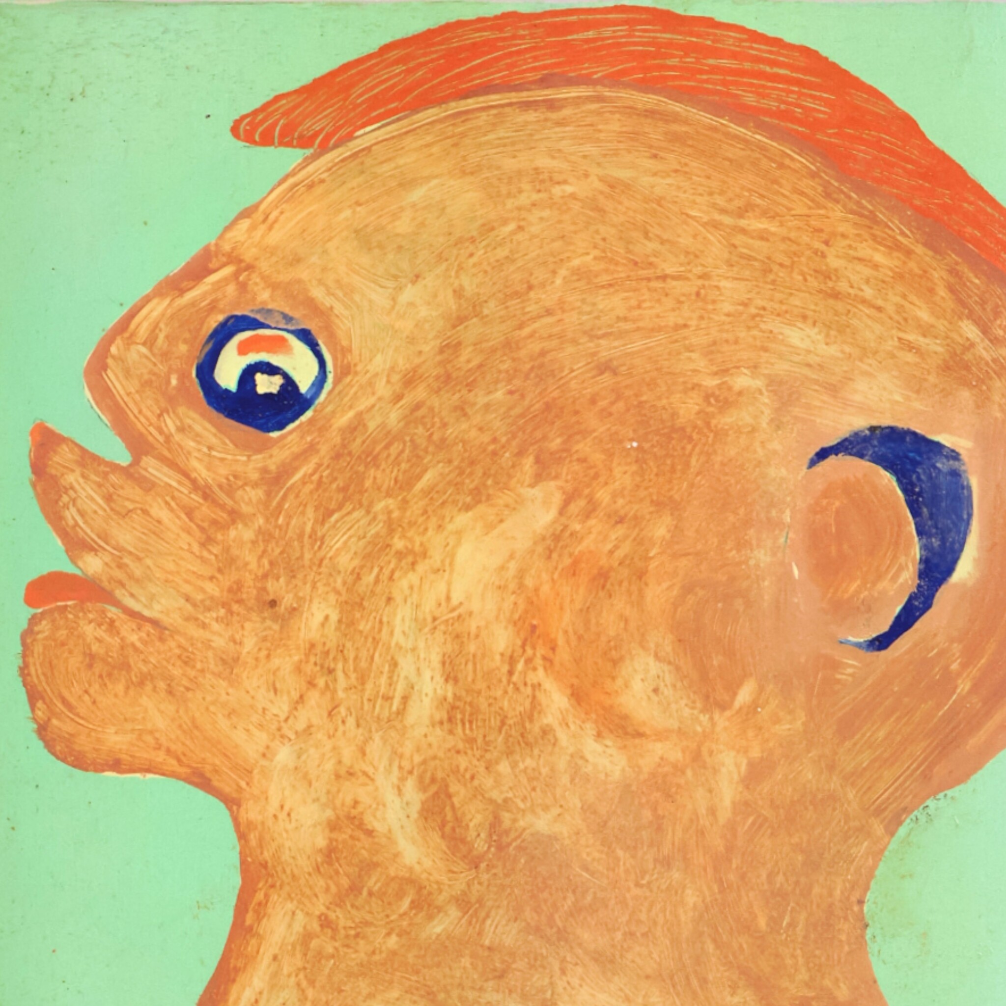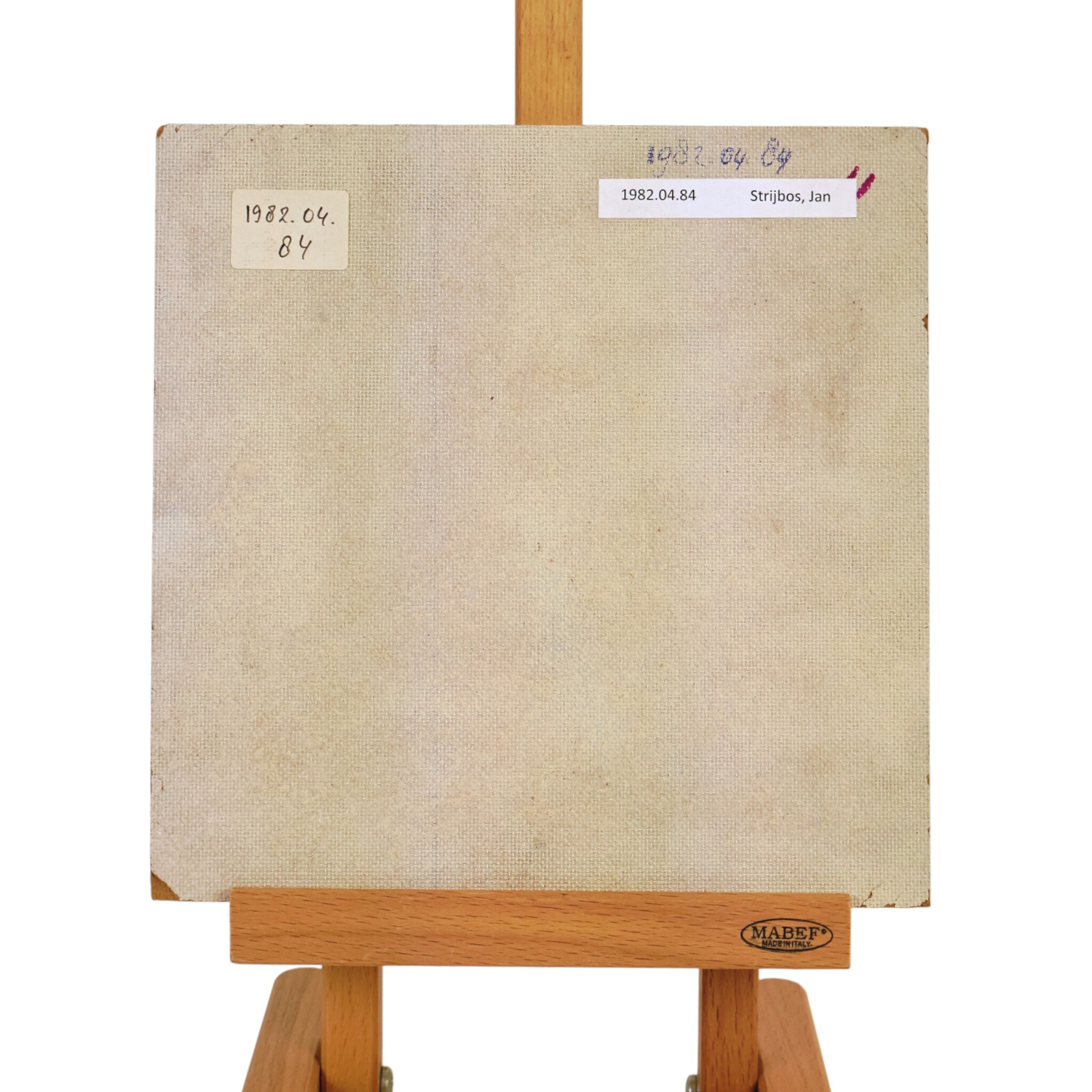 Jan Strijbos, 'Hoofd met Hare Krishna-kapsel', 1970-1980. Olieverf op hardboard, zonder lijst. Portretkop zijaanzicht van persoon met grotendeels kaalgeschoren hoofd met oranjerode haren aan bovenkant. Signatuur ontbreekt. Jan (Johannes) Strijbos (Eindhoven 1896 - Merkelbeek 1977) was timmerman van beroep en na zijn pensioen een autodidact-kunstschilder in de naïeve stijl. Conditie: vertoont gebruikssporen. Afmetingen: 21 x 21 cm.