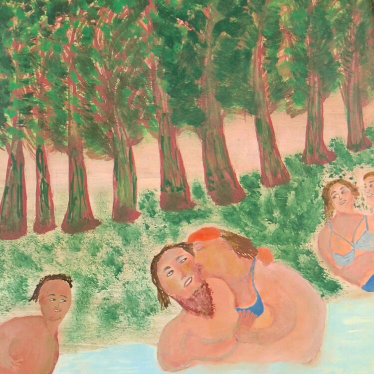 Jan Strijbos, 'Kijk uit, de zon gaat onder', 1975-1980. Olieverf op hardboard in houten lijst. Schildering van zes personen in het water naast een rij bomen. Titel linksonder. Signatuur rechtsonder. Jan (Johannes) Strijbos (Eindhoven 1896 - Merkelbeek 1977) was timmerman van beroep en na zijn pensioen een autodidact-kunstschilder in de naïeve stijl. Hij maakte zijn houten lijsten zelf. Conditie: goed; lijst vertoont gebruikssporen. Afmetingen: beeldvlak 40,5 x 39,5 cm, met lijst 59 x 46 x 2,7 cm.