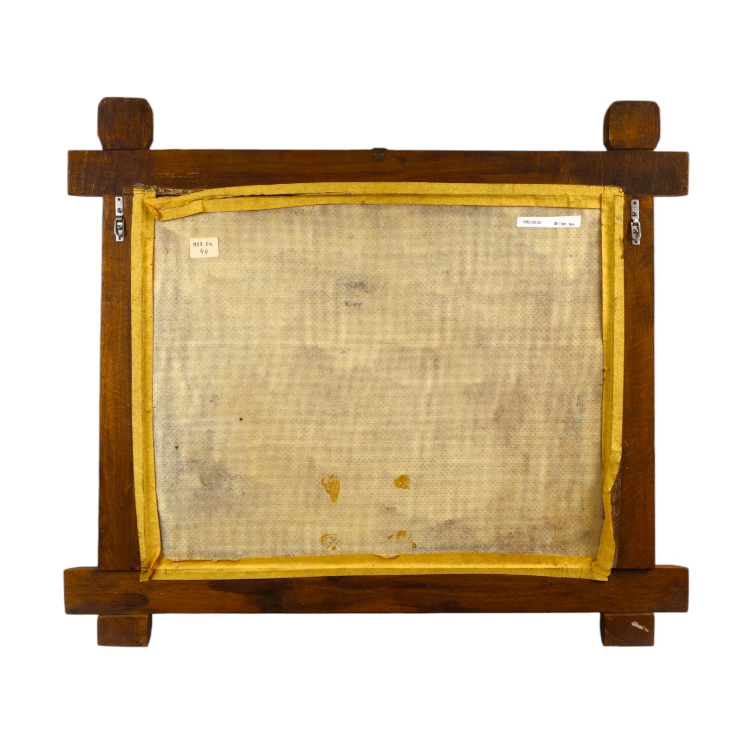 Jan Strijbos, 'Landschap met boerderij in vogelvlucht, op de voorgrond ruiter en boerin', 1960-1980. Olieverf op hardboard in eikenhouten lijst met hoekdecoratie. Schilderij van een boerderij met twee personen. Signatuur linksonder. Jan (Johannes) Strijbos (Eindhoven 1896 - Merkelbeek 1977) was timmerman van beroep en na zijn pensioen een autodidact-kunstschilder in de naïeve stijl. Hij maakte zijn houten lijsten zelf. Conditie: goed. Afmetingen: beeldvlak 50 x 42,5 cm, met lijst 61 x 54 x 1,5 cm. Conditie: goed. Afmetingen: beeldvlak 52 x 41 cm, met lijst 70 x 63 x 2,5 cm.
