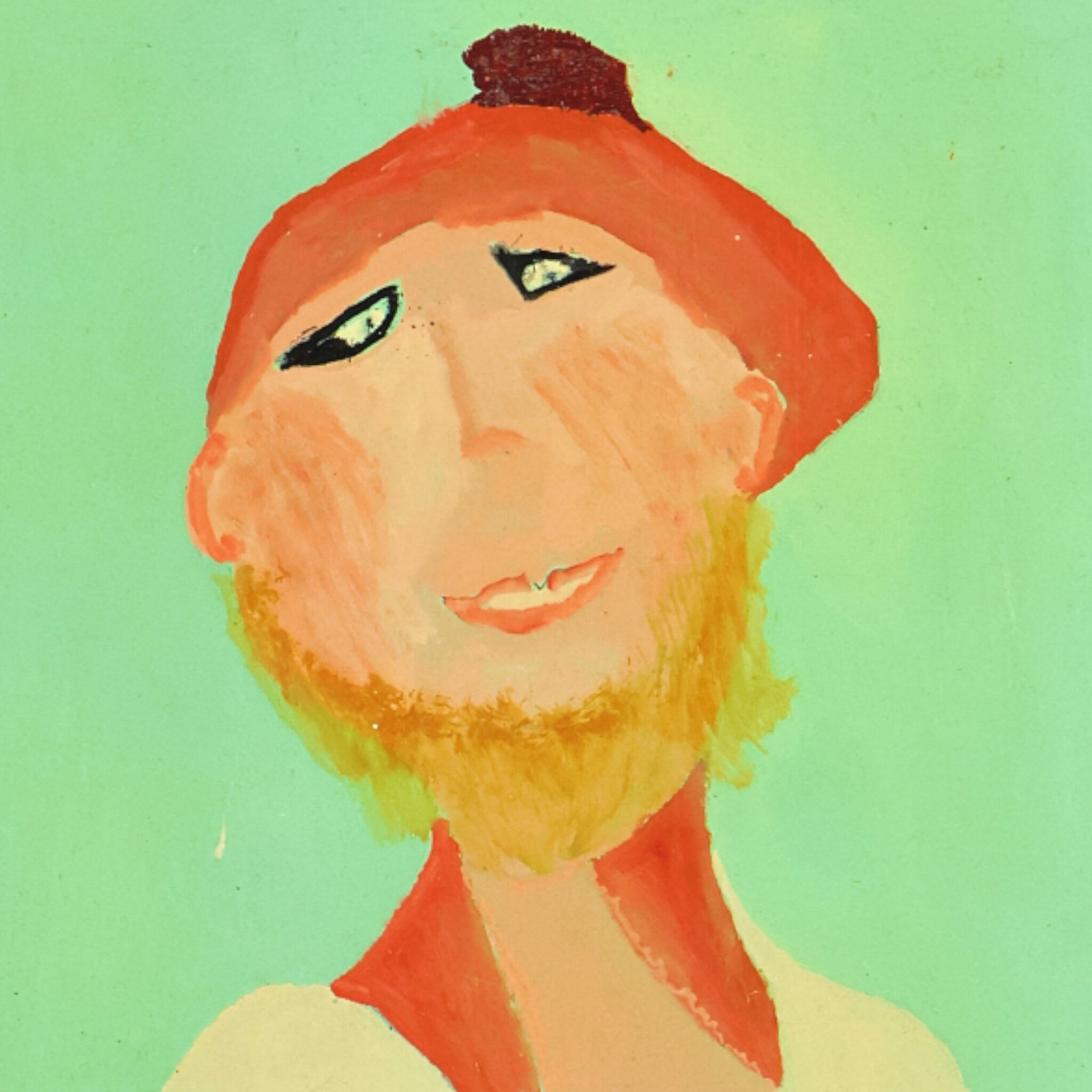 Jan Strijbos, 'Man met baard en baret', 1960-1980. Olieverf op triplex, zonder lijst. Borstbeeld portret van man met baard en baret in wit met rode kleding op een blauwgroene achtergrond. Signatuur ontbreekt.