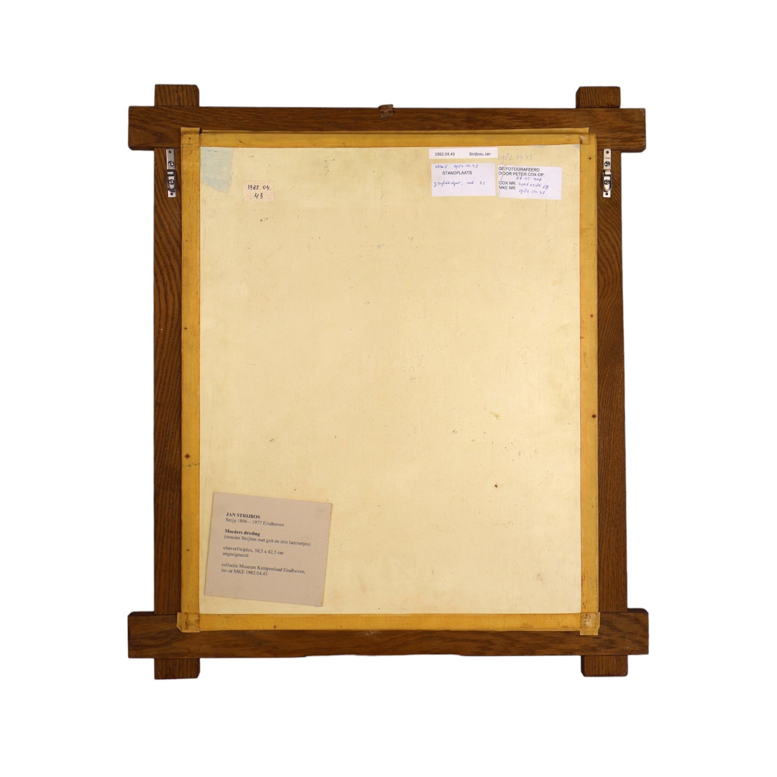 Jan Strijbos, 'Moeders Drieling' (Moeder Stijbos met geit en drie lammetjes), 1960-1980. Olieverf op triplex in eikenhouten lijst met hoekdecoratie. Volledig portret van een oudere vrouw voor een huis. Titel linksonder. Signatuur ontbreekt. Jan (Johannes) Strijbos (Eindhoven 1896 - Merkelbeek 1977) was timmerman van beroep en na zijn pensioen een autodidact-kunstschilder in de naïeve stijl. Hij maakte zijn houten lijsten zelf. Conditie: goed. Afmetingen: beeldvlak 50 x 42,5 cm, met lijst 61 x 54 x 1,5 cm.