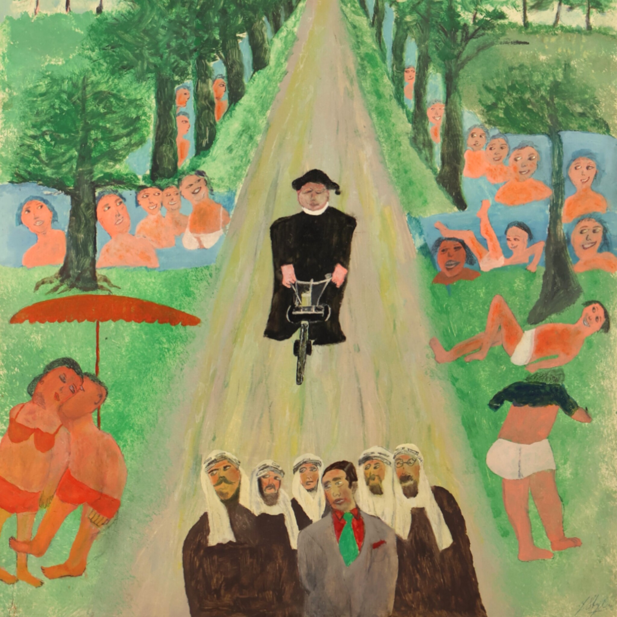 Jan Strijbos, 'Pastoor op Solex', 1960-1980. Olieverf op hardboard in houten lijst. Schildering van pastoor op bromfiets met zwemmende en zonnende mensen in de berm en sloten, op de voorgrond vijf Arabieren en een Europeaan. Signatuur rechtsonder. Jan (Johannes) Strijbos (Eindhoven 1896 - Merkelbeek 1977) was timmerman van beroep en na zijn pensioen een autodidact-kunstschilder in de naïeve stijl. Hij maakte zijn houten lijsten zelf. Conditie: lijst vertoont gebruikssporen. Afmetingen: beeldvlak 55 x 45 cm, met lijst 64 x 54 x 1,2 cm.