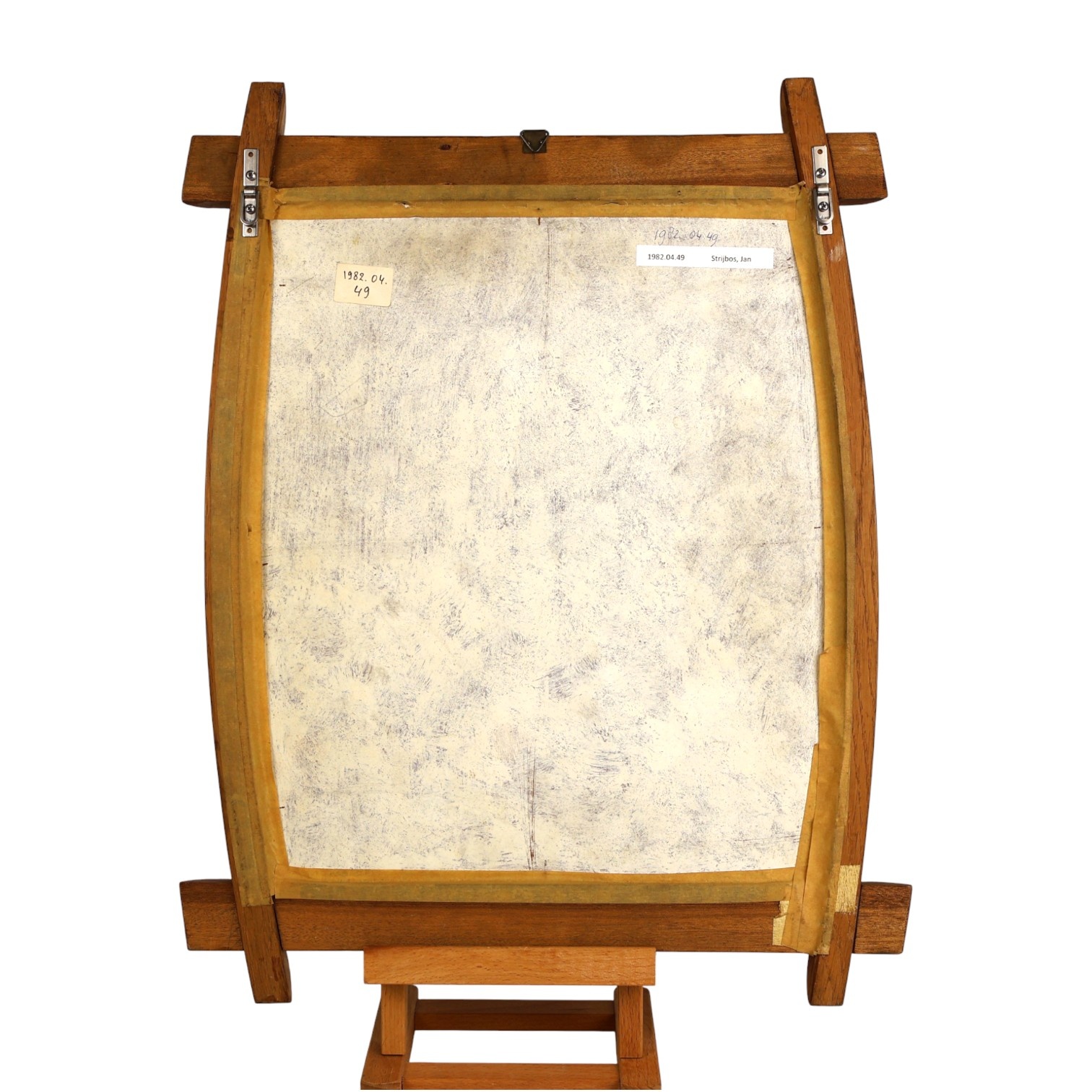 Jan Strijbos, 'Tantum ergo, Eert dit wonder', 'D-N 2-1-droevig', 1978. Olieverf op hardboard in houten lijst. Volledig portret van drie personen zittend op een bank. Titel en signatuur linksonder. Jan (Johannes) Strijbos (Eindhoven 1896 - Merkelbeek 1977) was timmerman van beroep en na zijn pensioen een autodidact-kunstschilder in de naïeve stijl. Hij maakte zijn houten lijsten zelf. Conditie: goed, lijst vertoont gebruikssporen. Afmetingen: beeldvlak 37,5 x 33 cm, met lijst 51 x 40 x 2,2 cm.