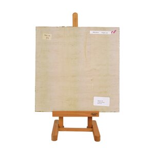 Jan Strijbos, 'Vrouw met kruisje', 1960-1980. Olieverf op triplex, zonder lijst. Borstbeeld portret van vrouw met kruisje om de hals kijkend naar een schilderij van Christus aan het kruis. Signatuur ontbreekt. Jan (Johannes) Strijbos (Eindhoven 1896 - Merkelbeek 1977) was timmerman van beroep en na zijn pensioen een autodidact-kunstschilder in de naïeve stijl. Conditie: vertoont gebruikssporen. Afmetingen: 30,5 x 30 cm.