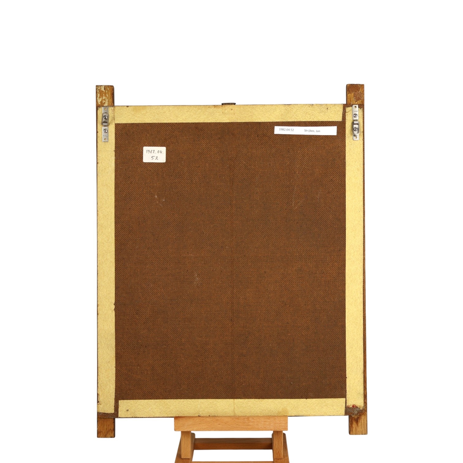 Jan Strijbos, 'Vrouw met twee bosjes bloemen in de handen', 1975-1980. Olieverf op hardboard in houten lijst. Volledig portret van een vrouw op een donkere achtergrond. Signatuur ontbreekt. Jan (Johannes) Strijbos (Eindhoven 1896 - Merkelbeek 1977) was timmerman van beroep en na zijn pensioen een autodidact-kunstschilder in de naïeve stijl. Hij maakte zijn houten lijsten zelf. Conditie: goed; lijst vertoont gebruikssporen. Afmetingen: beeldvlak 38,8 x 33 cm, met lijst 49,4 x 38 x 1,3 cm.