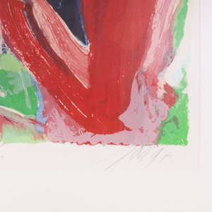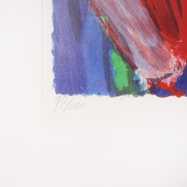 JAS, Mokum Red, 1994. Zeefdruk op papier in zwartkleurige lijst, oplage 94/100. Kleurrijke abstracte voorstelling in rood, groen, blauw en wit. Linksonder oplagenummer, in het midden de titel en rechtsonder signatuur en jaartal. Conditie: goed, gebruikssporen aan lijst en hoek rechtsboven zit beetje los. Afmeting lijst: 94,5 x 74,5 cm.