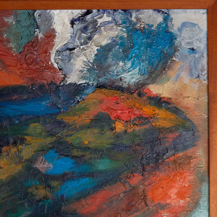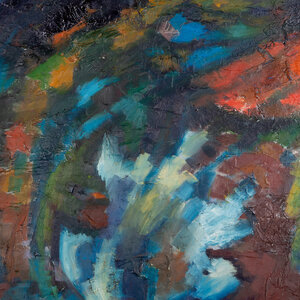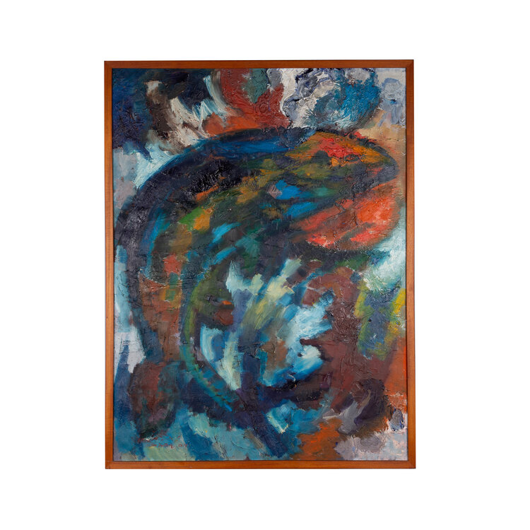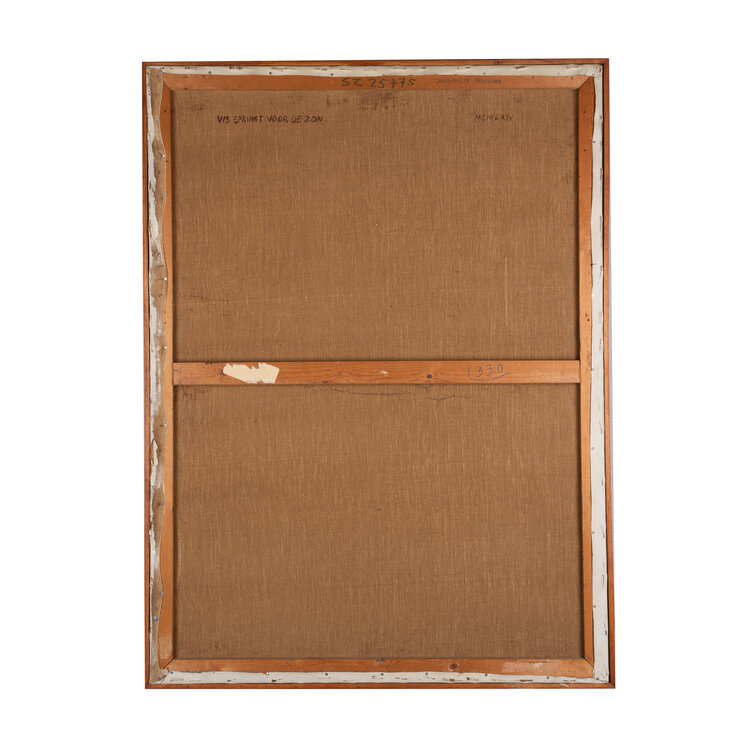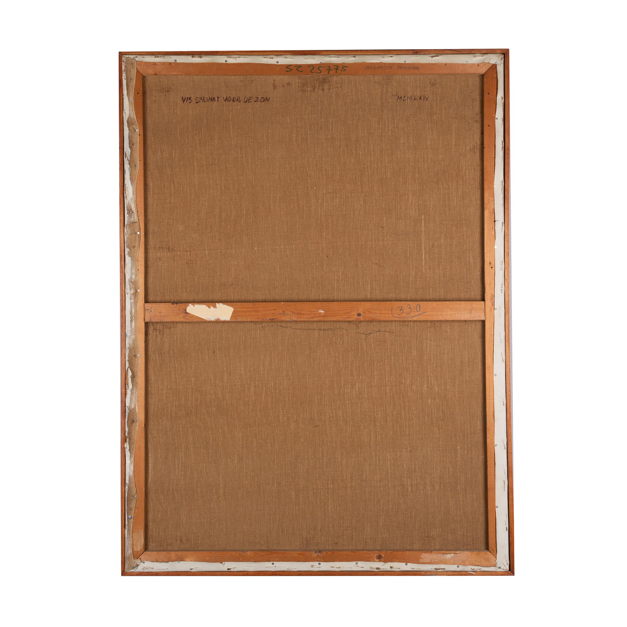 Jean Baptiste de Winter, 'Vis springt voor de zon', 1964. Verf op doek op spieraam in houten lijst. Geabstraheerde afbeelding van een vis geschilderd in wilde penseelstreken voor een kleurrijke achtergrond. Signatuur linksonder met LXIV. Conditie: wat craquelé in de verf, verder in goede conditie. Afmetingen: ca. 120 x 90 cm.