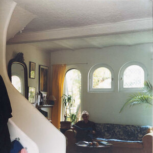 Foto, 'Intérieur 6', uit een serie van foto's van Jean-Louis Garnell (1954, Dolo, Frankrijk) in Angers, Frankrijk, 2001. Foto op aluminium plaat van een interieur van een huis. Over deze serie zei Jean-Louis Garnell: "I'm interested in interiors that change in the course of the days, in connection with the circumstances in life, the signs of daily life." Deze fotoserie behoort tot de foto expositie 'Les intérieurs du monde' uit 2001 in het Zaans Museum. Een fascinerend document van interieurs in 7 steden door 14 fotografen uit 5 landen, in samenwerking tussen de gemeenten Zaanstad en Haarlem met hun zustersteden. Angers heeft een stedenband met Haarlem. Conditie: Vertonen gebruikssporen, beschadigingen aan de randen, taperesten op de achterkant. Afmetingen: 40 x 50 cm.