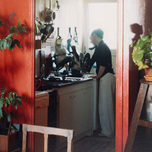 Foto, 'Intérieur 7', uit een serie van foto's van Jean-Louis Garnell (1954, Dolo, Frankrijk) in Angers, Frankrijk, 2001. Foto op aluminium plaat van een interieur van een huis. Over deze serie zei Jean-Louis Garnell: "I'm interested in interiors that change in the course of the days, in connection with the circumstances in life, the signs of daily life." Deze fotoserie behoort tot de foto expositie 'Les intérieurs du monde' uit 2001 in het Zaans Museum. Een fascinerend document van interieurs in 7 steden door 14 fotografen uit 5 landen, in samenwerking tussen de gemeenten Zaanstad en Haarlem met hun zustersteden. Angers heeft een stedenband met Haarlem. Conditie: Vertonen gebruikssporen, beschadigingen aan de randen, taperesten op de achterkant. Afmetingen: 40 x 50 cm.