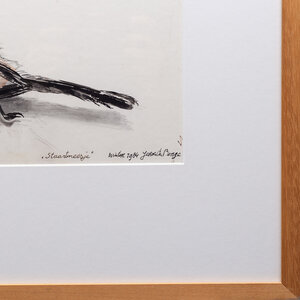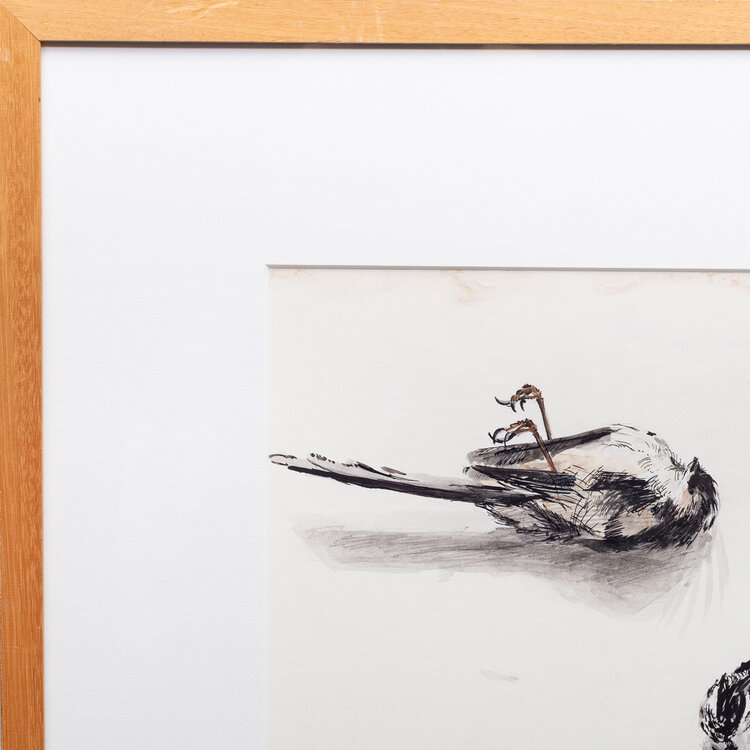 Jeroen ten Berge (Haarlem, 1939), 'Staartmeesje', winter 1984. Gemengde techniek op papier in houten lijst met passe-partout. Afbeelding van een dood staartmeesje van drie verschillende kanten getekend. Signatuur rechtsonder. Conditie: verkleuring werk met name bovenaan, gebruikssporen lijst. Afmetingen lijst: 49 x 61 cm; beeldvlak: 26 x 40 cm.
