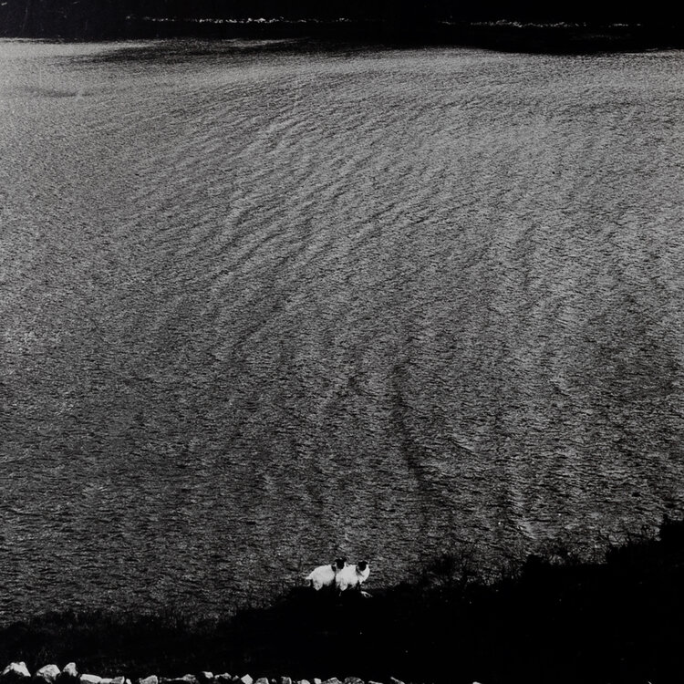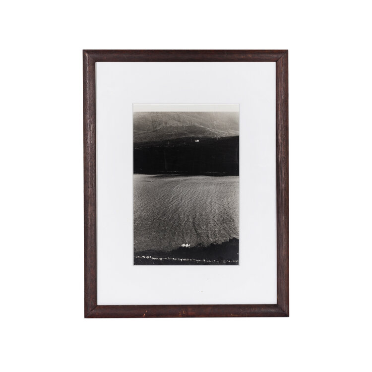 Jirina Simajchlova, 'Schapen'. Zwart-witfoto van een landschap van bergen en water met twee schapen, in donkerbruin houten lijst met passe-partout. Datering onbekend. Conditie: gebruikssporen lijst. Afmetingen lijst: 43 x 33 cm; beeldvlak: 26 x 17 cm.