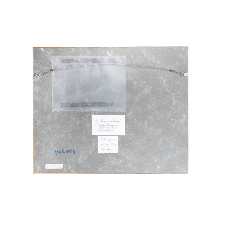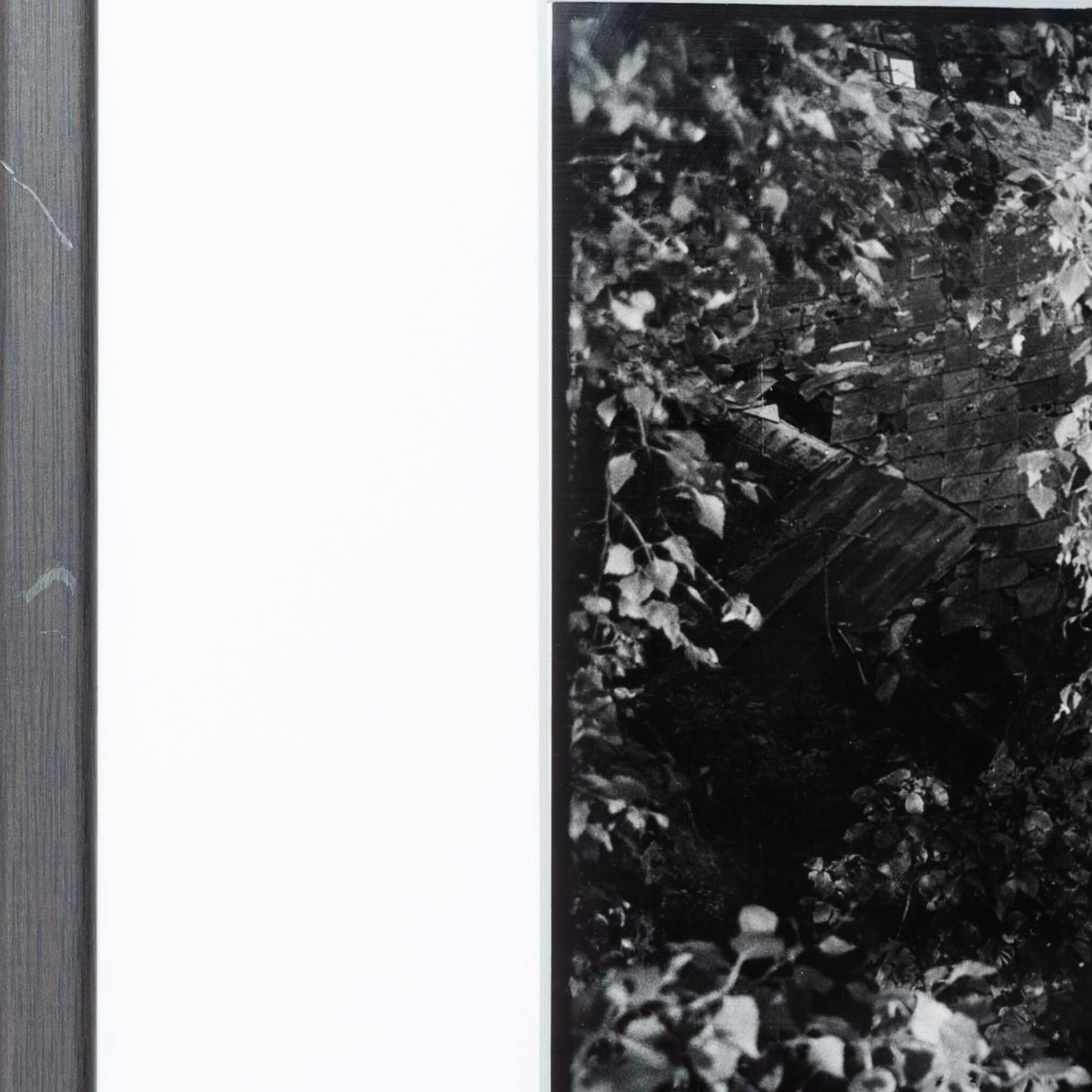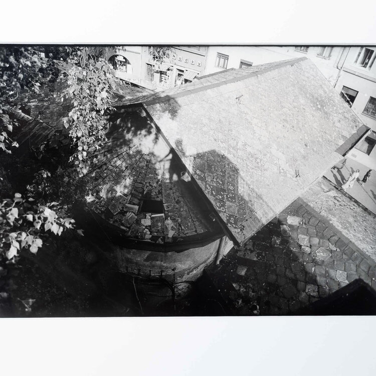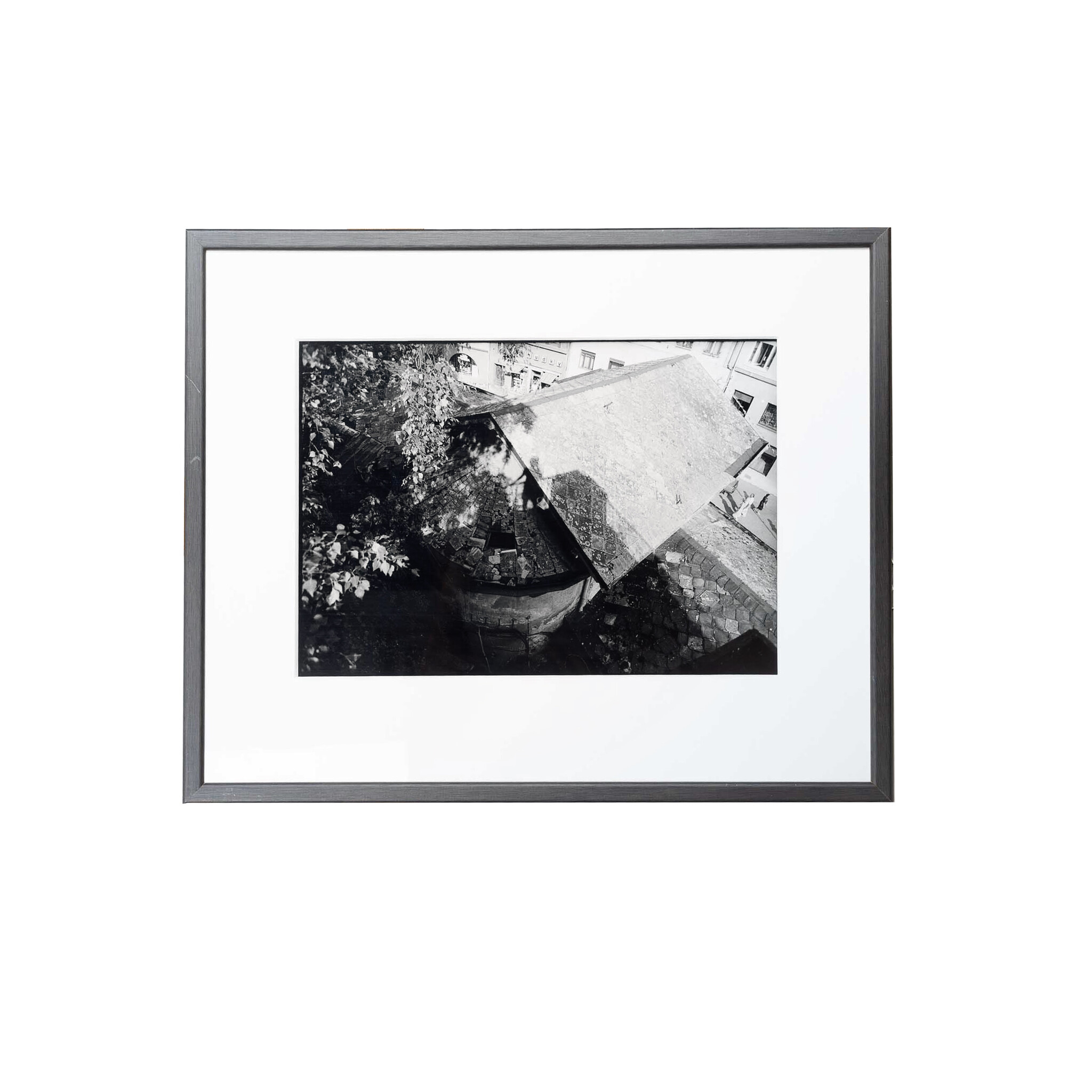 Jirina Simajchlova, 'Zelfportret', datering onbekend. Zwart-witfoto in een zwart houten lijst met passe-partout. Afbeelding van schaduwen op een dak, genomen vanaf een hoger gebouw in Karlovy Vary, Tsjechië. Hierin is de schaduw van de fotograaf te herkennen. Signatuur ontbreekt. Conditie: beschadigingen aan lijst, glas is vies. Afmetingen: beeldvlak 21 x 30 cm; lijst 36 x 44,5 cm.