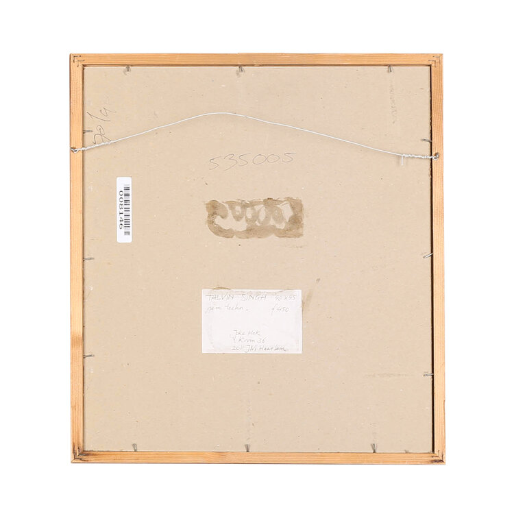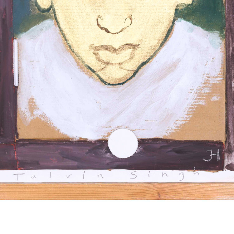 J.M. Hak, Talvin Singh, jaartal onbekend. Gemengde techniek op papier en kartonnen verpakking in houten lijst. Portret van Talvin Singh in goud met blauw haar. Onderaan titel. Conditie: goed, glas in omlijsting mist. Afmetingen lijst: 44 x 40 cm.