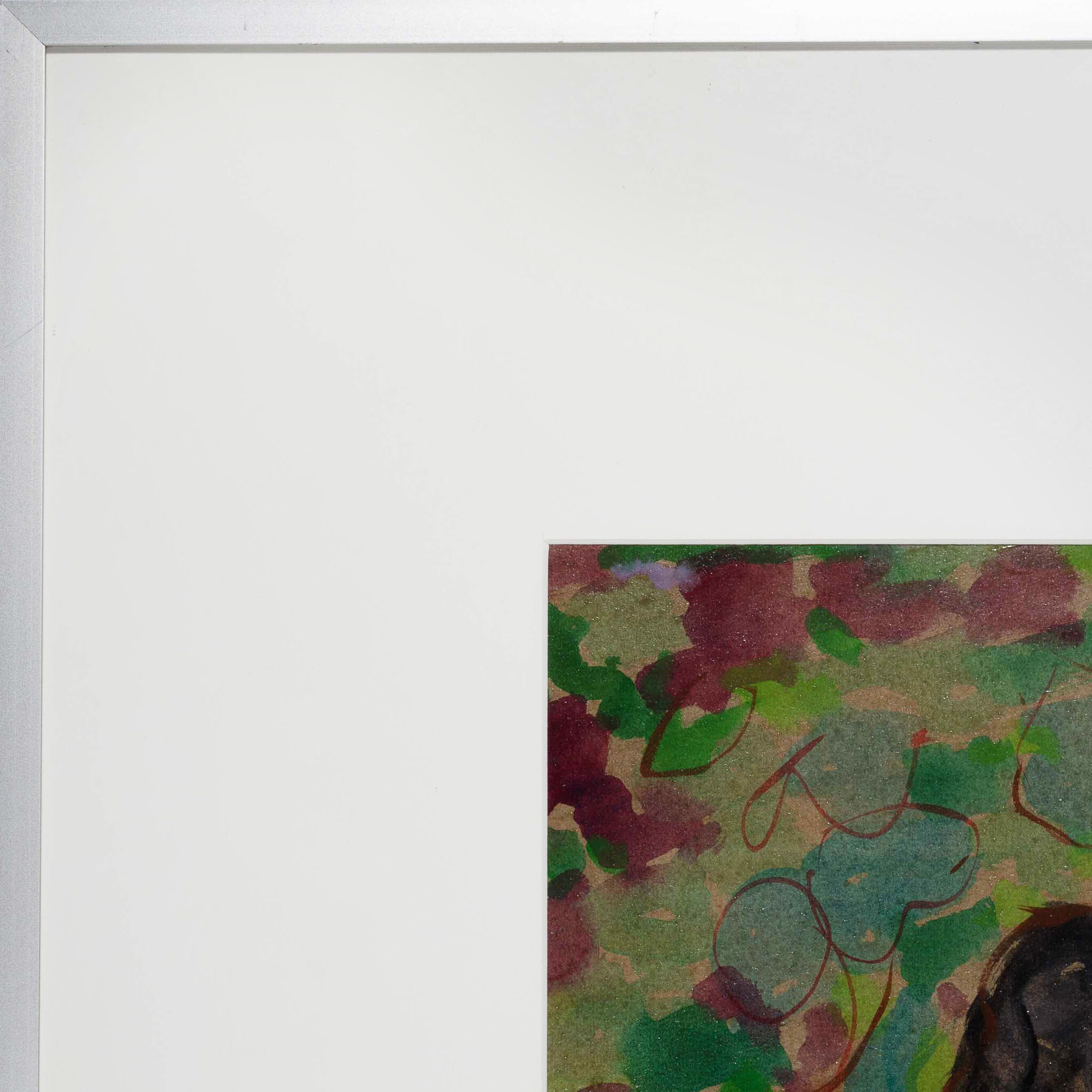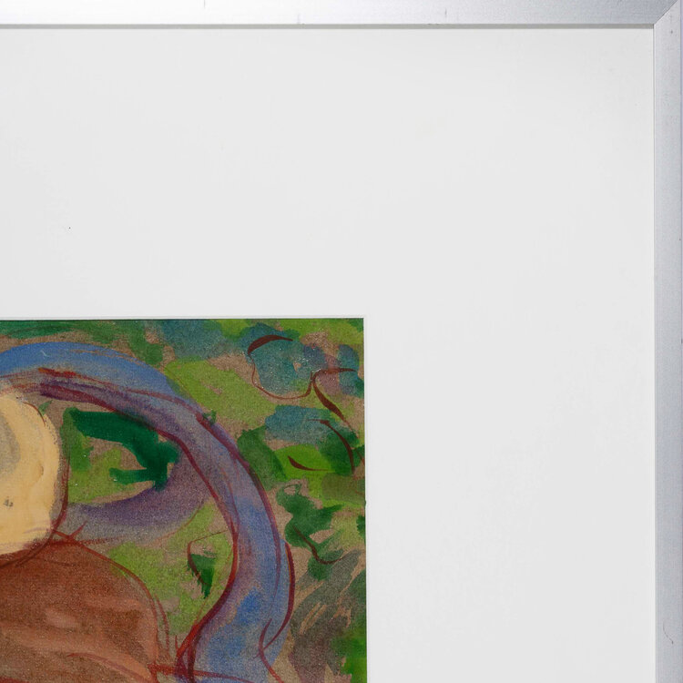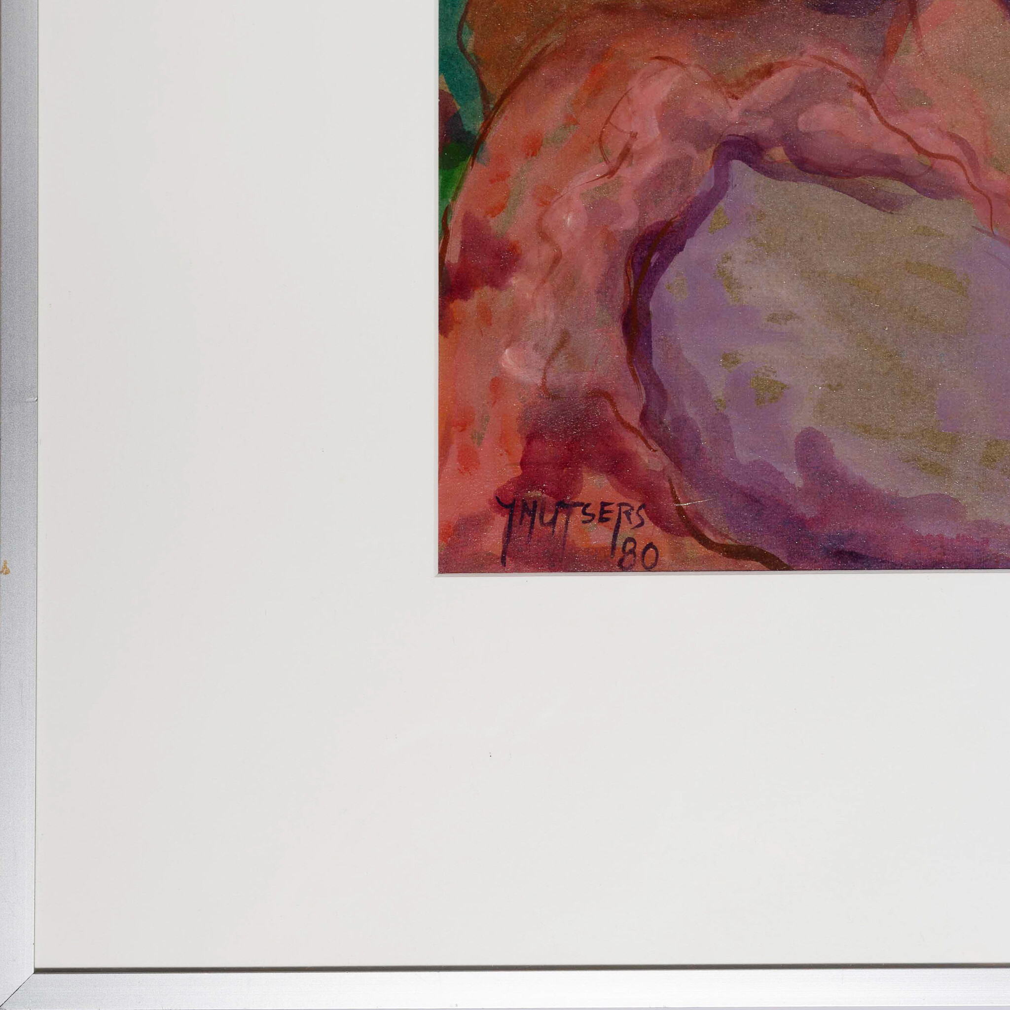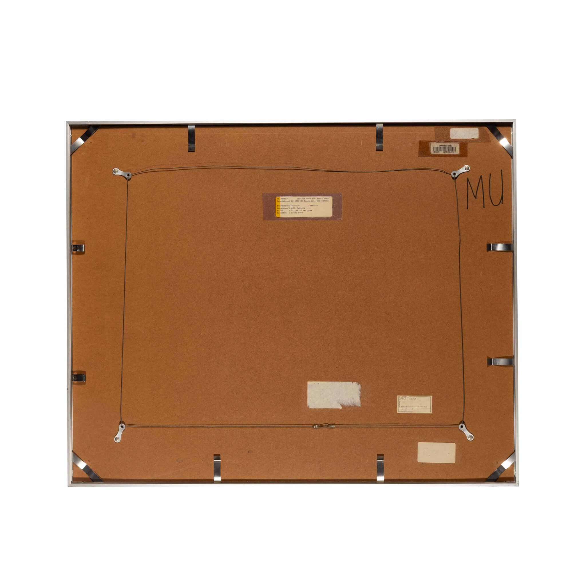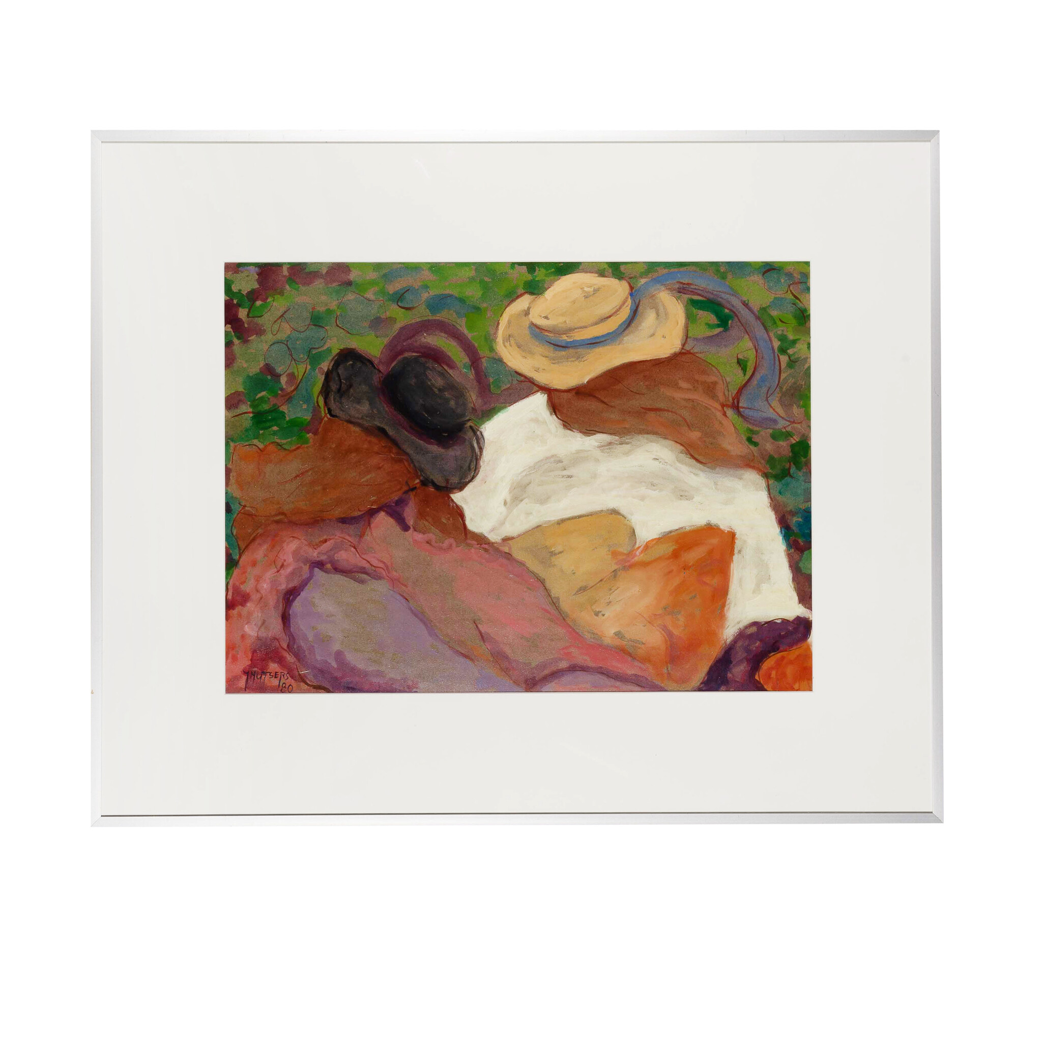 J.M. Mutsers, 'Zitten in het gras', 1980. Acryl op papier met passe-partout in metalen lijst met kunststof plaat. Afbeelding van twee hoeden met kleding in het gras. Signatuur linksonder. Conditie: vertoont gebruikssporen. Afmetingen incl lijst: ca 66 x 81 cm.