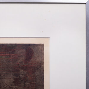 Johan van Reede (Rotterdam, 1921 - 2016), 'Muur'. Ets/aquatint oplage 5/12, in metalen lijst met passe-partout. Abstracte afbeelding van vlakken in bruin- en grijstinten. Signatuur rechtsonder. Datering: 1975. Conditie: gebruikssporen lijst, stickers/vlekken op glas, verkleuring papier. Afmetingen lijst: 75,5 x 71 cm; beeldvlak: 49 x 45 cm.