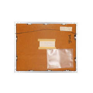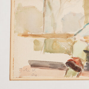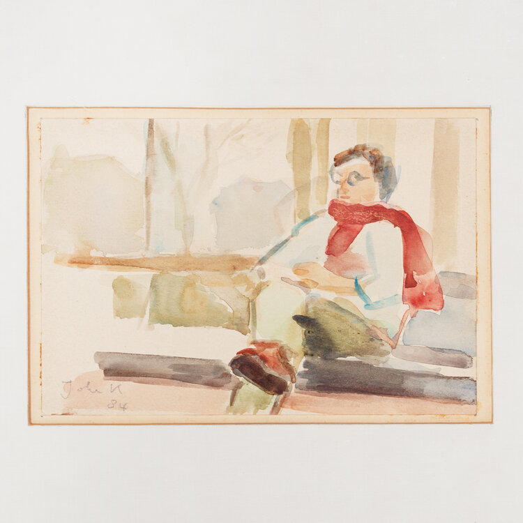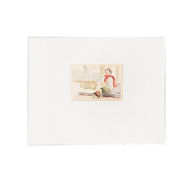 Joke Kokkelkoren, 'Vrouw met rode shawl'. Aquarel in metalen lijst. Afbeelding van een vrouw met rode shawl, zittend op een bankje. Signatuur linksonder. Datering: 1984. Conditie: verkleuring papier, beschadigingen aan lijst, taperesten op lijst en glasplaat. Afmetingen: lijst 40,5 x 50,5 cm; beeldvlak 12,5 x 18 cm.
