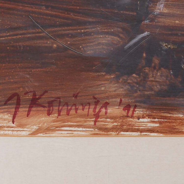 Joost Konings, Koe, 1991. Olieverf op papier in metalen lijst. Afbeelding van een koe voor een bruin met blauwe achtergrond. Er is gebruik gemaakt van verschillende schilder technieken. Rechtsonder signatuur en jaar. Conditie: gebruikssporen op de lijstt. Afmeting lijst: 80 x 110 cm.