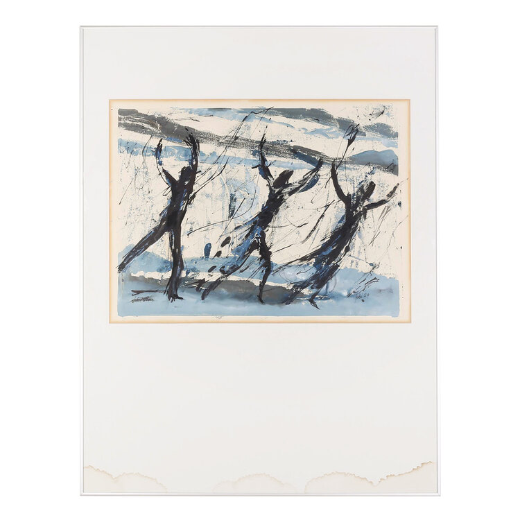 Joke de Boer, Vlucht in dans, 1989. Gemengde techniek op papier in metalen lijst. Illustratie van dansende mensen met handen omhoog in blauw, grijs en zwart. Conditie: gebruikssporen aan lijst, watervlekken onderaan het passe-partout. Afmeting lijst: 90 x 70 cm