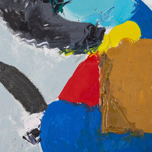 Jurjen de Haan, 'Zwarte koning', 2000. Olieverf op doek in zwarte lijst. Abstract werk met kleurrijke vormen. Signatuur linksonder. Conditie: lijst vertoont gebruikssporen. Afmetingen werk: 200 x 50 cm.