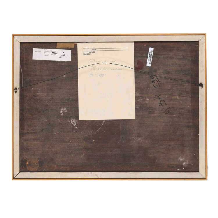 K. Wassenaar, Olietanks in aanbouw, jaartal onbekend. Olieverf op doek, in houten lijst. Abstracte voorstelling tegen paarse achtergrond met rechthoeken in verschillende kleuren. Afmetingen: 54 x 72 cm. Conditie: Lijst toont sporen van gebruik.