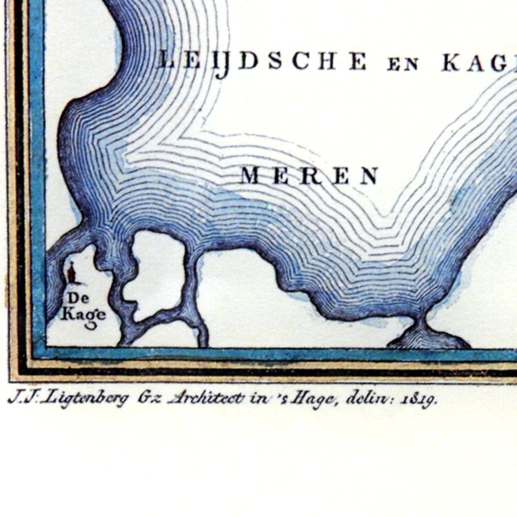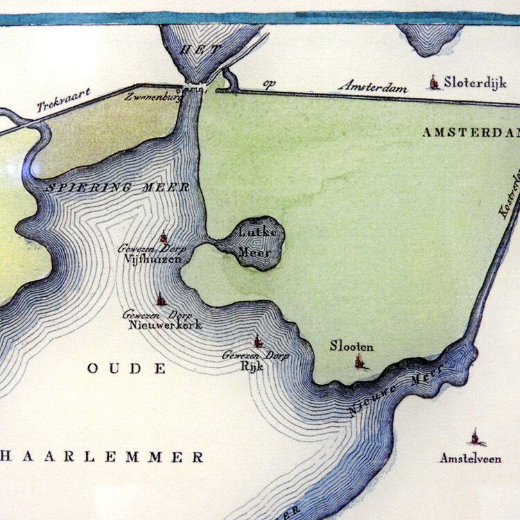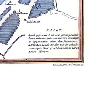Afdruk van een ingekleurde historische geografische kaart van het ontstaan van het Haarlemmermeer. Ontworpen door J.J. Ligtenberg Gz, gegraveerd door C. van Baarsel & Zoon, tussen 1817 en 1826. De kaart toont het ontstaan van het Haarlemmermeer in ca. 300 jaar. Datering reproductie onbekend. Het laatste historische kaartje is van 1819. Conditie: vertoont lichte gebruikssporen. Afmetingen: H. 62 cm, Br. 82 cm.