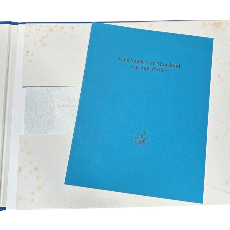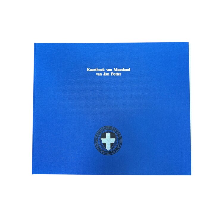 'Kaartboek van Maasland', Jan Potter (1570); uitgave 1991. Samengesteld door de Werkgroep Kaartboek van de Stichting Herdenking 750-jarige Vestiging Ridderlijke Duitsche Orde Balije van Utrecht in Maasland. Jan Jansz. Potter (ca. 1530-1590) is de auteur van de kaarten. Het logo op de omslag is van de Ridderlijke Duitsche Orde Balije van Utrecht. Gebonden hardcover in blauwe linnen omslag met losse uitvouwbare kaarten. Conditie: vertoont gebruikssporen en ouderdomsplekken, zoals foxing. Afmetingen: 36 x 43 cm.