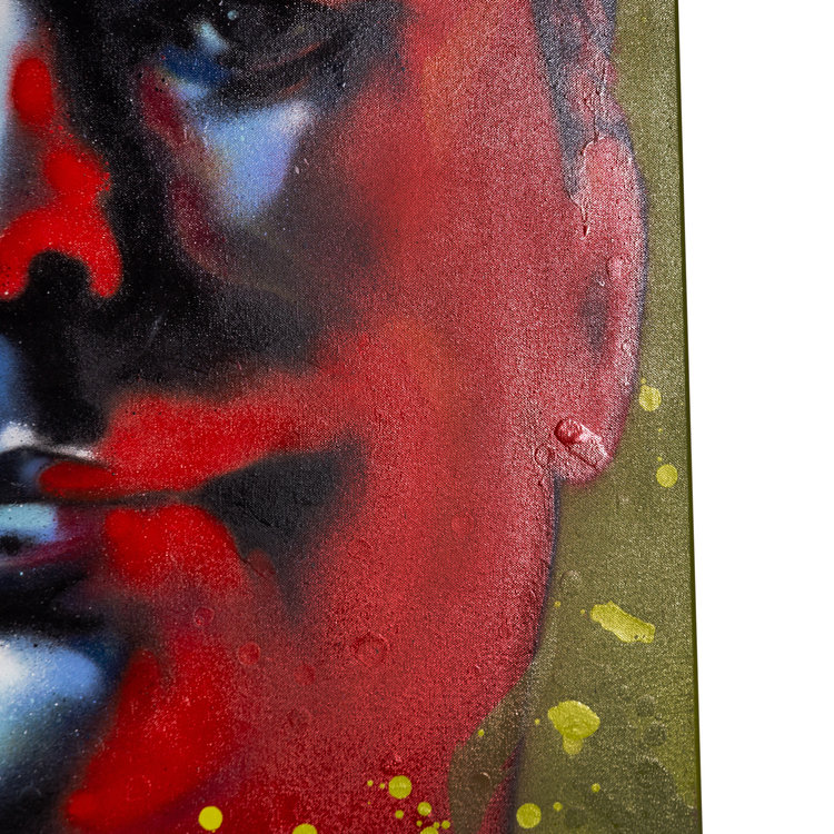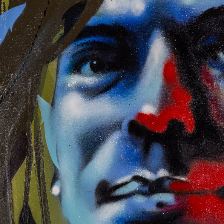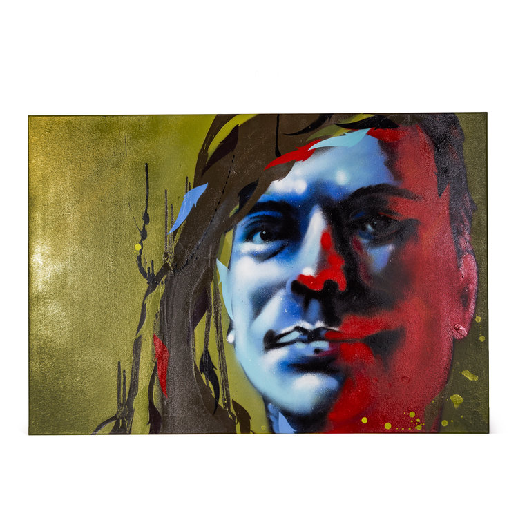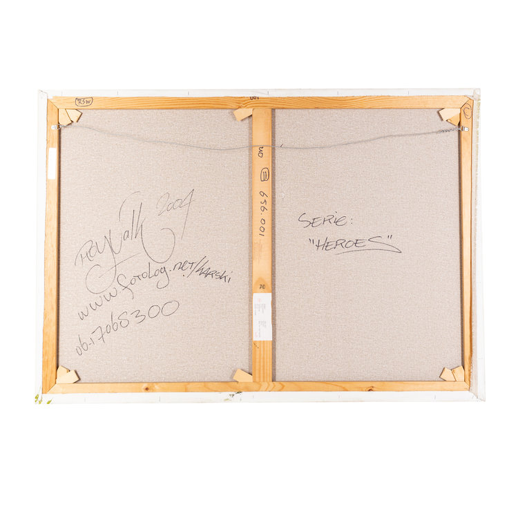 Karski, Hero, jaartal onbekend. Gemengde techniek op doek. Close-up van een gezicht in blauw en rood voor groene achtergrond. Conditie: lichte gebruikssporen. Afmeting: 70 x 100 cm