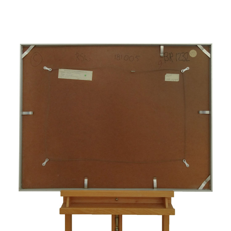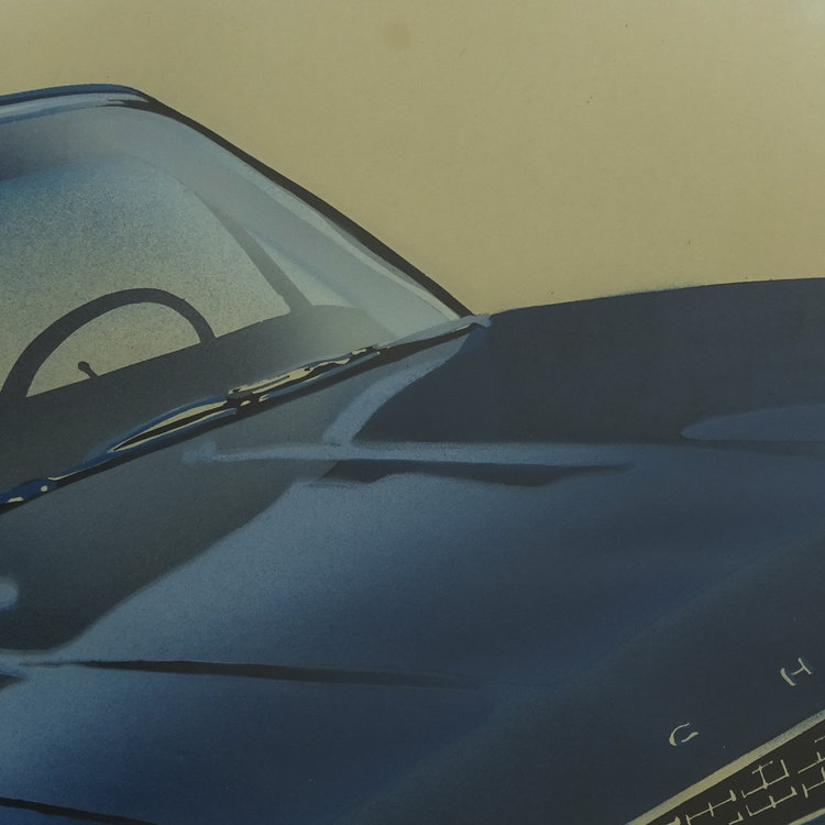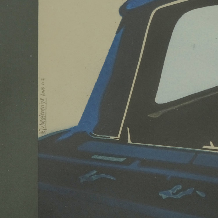 Kees Jan van Kesteren, Chrysler. Lino, oplage 1/2. Close up van een diepblauwe Chrysler tegen een beige achtergrond. Conditie: Het werk is in goede conditie maar de lijst toont sporen van gebruik. Afmetingen: Beeldvlak 31 x 70 cm, lijst: 61 x 81 cm.