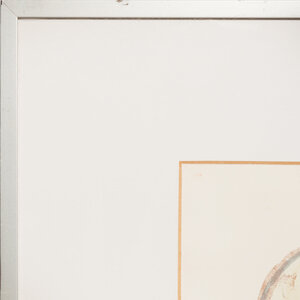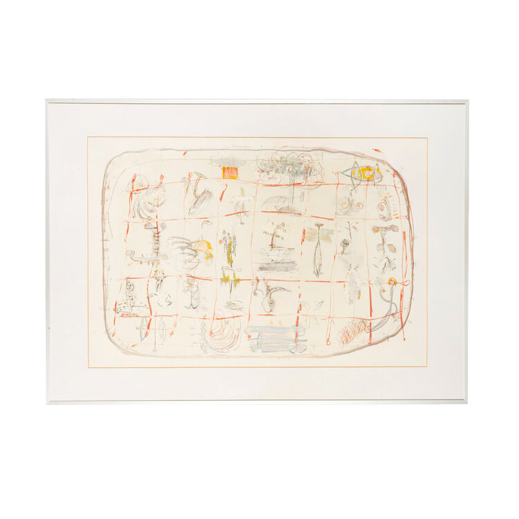 Kees Landa, 'Zoological', 1992. Steendruk, houtsnede, tekening met passe-partout in metalen lijst met kunststof plaat. Het abstracte werk bestaat uit verschillende kleine afbeeldingen in vakjes in de kleuren rood, geel en groen. Signatuur linksonder. Conditie: vertoont gebruikssporen. Afmetingen incl lijst: ca 84,5 x 111 x 2 cm.