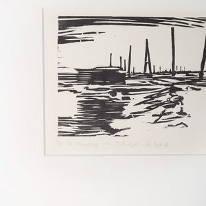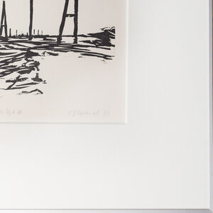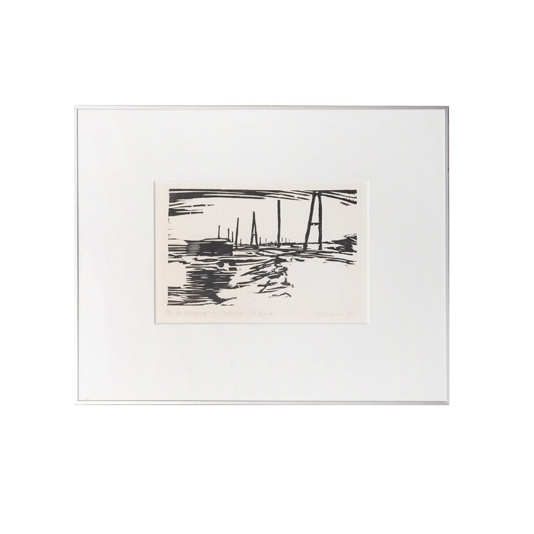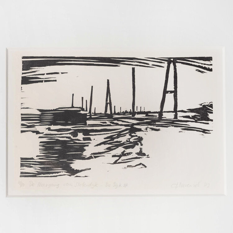 Kees Nevenzel (Amsterdam, 1951), 'De Neergang van Sloterdijk - De Dijk', 1982. Houtsnede in metalen lijst, oplage 4/10. Abstracte weergave van een landschap. Signatuur rechtsonder. Conditie: werk is in goede staat, lijst toont hier en daar wat gebruikssporen zoals krasjes, en paar kleine chipjes in het glas. Afmetingen lijst: 40 × 50 cm, beeldvlak: 17 x 25 cm.