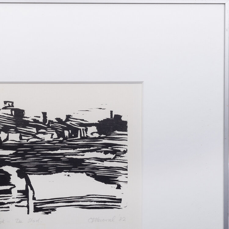 Kees Nevenzel (Amsterdam, 1951), 'De Neergang van Sloterdijk - De Stad', 1982. Houtsnede in metalen lijst met passe-partout, oplage 4/10. Stilistische voorstelling van een stad in zwart en wit. Signatuur rechtsonder. Conditie: lijst vertoont gebruikssporen, taperesten op glas. Afmetingen: lijst 40,5 x 50,5 cm; beeldvlak 14 x 21 cm.