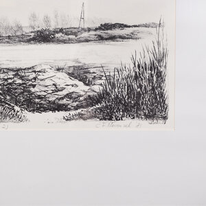 Kees Nevenzel (Amsterdam, 1951), 'Zuid Punt Ruigoord', 1981. Litho in metalen lijst, oplage 10/15. Afbeelding van een landschap met weiland en slootjes. Signatuur rechtsonder. Conditie: papier is verkleurd, lijst vertoont gebruikssporen. Afmetingen: lijst 50,5 x 65,5 cm; beeldvlak 30 x 33 cm.