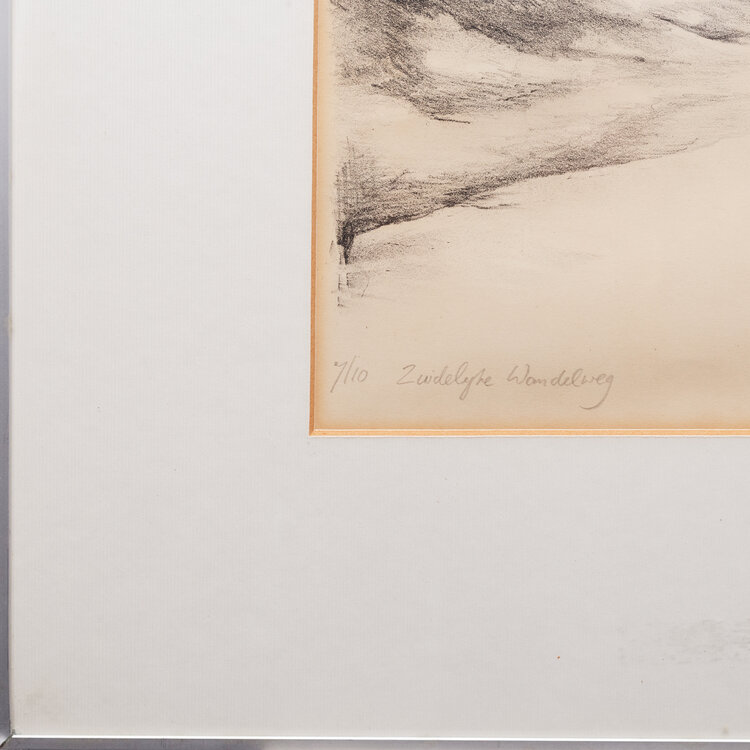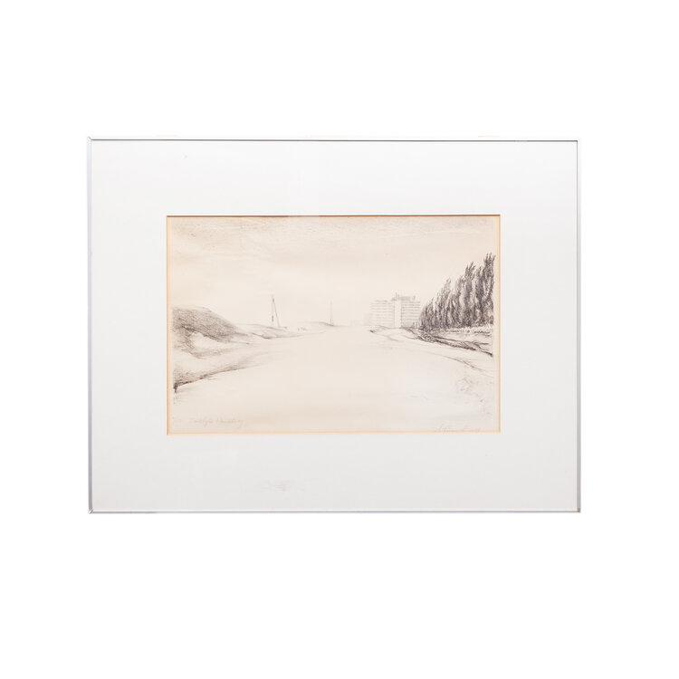 Kees Nevenzel (Amsterdam, 1951), 'Zuidelijke Wandelweg', 1978. Litho in metalen lijst met passe-partout, oplage 7/10. Tekening van een weg met in de verte een flatgebouw in zwart en wit. Signatuur rechtsonder. Conditie: verkleuring papier, lijst vertoont gebruikssporen, taperesten op glas. Afmetingen: lijst 50,5 x 65,5 cm; beeldvlak 29 x 44 cm.