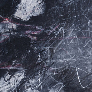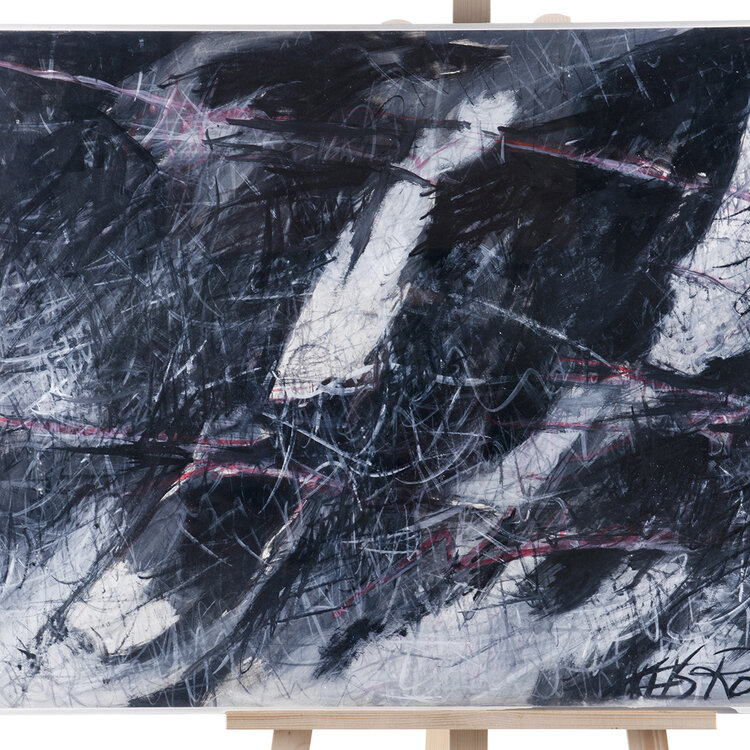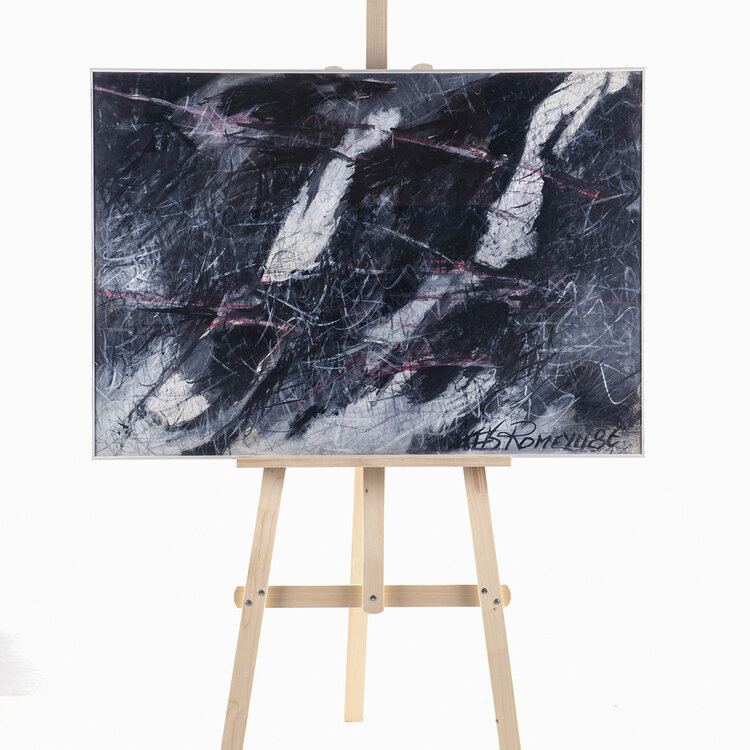 Kees Romeijn, Zt. I. Gouache. Het betreft een heel donker en abstract werk. Linksonder werd het kunstwerk voorzien van een signatuur en datering '86. Datering: 1986-1988. Conditie: het werk is in goede conditie, de lijst heeft lichte schade opgelopen. Afmetingen: ca. 70,0 x 100,0 cm.