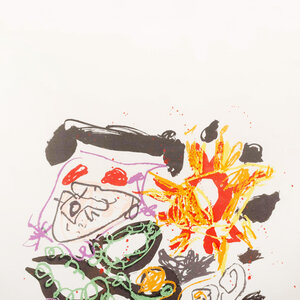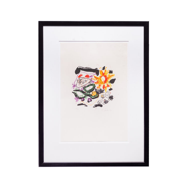 Kees Salentijn, Compositie, jaartal onbekend. Zeefdruk oplage 35/100. Abstracte voorstelling in zwart, rood, oranje, geel, paars en groen. Linksonder oplagenummer, rechtsonder signatuur. Het werk is ingelijst in passe partout achter museumglas. Conditie: goed, enkel lichte gebruikssporen aan de lijst. Afmeting: 71 x 53 cm.